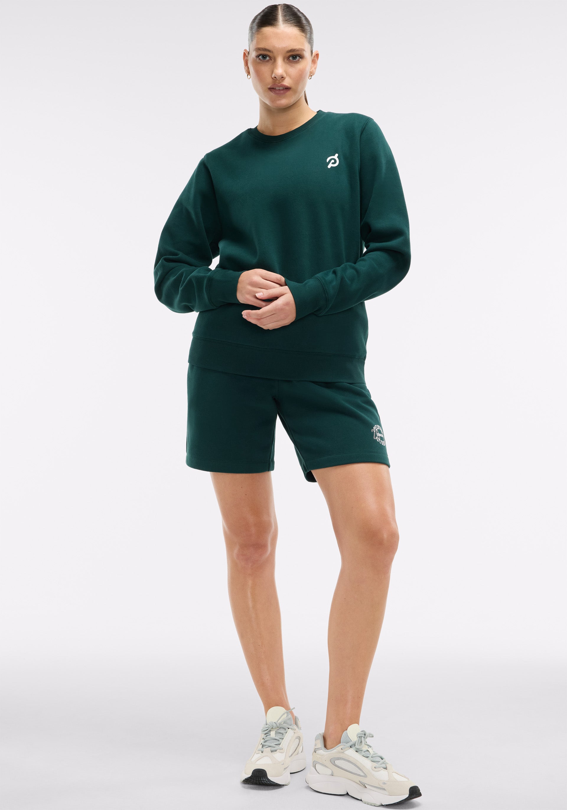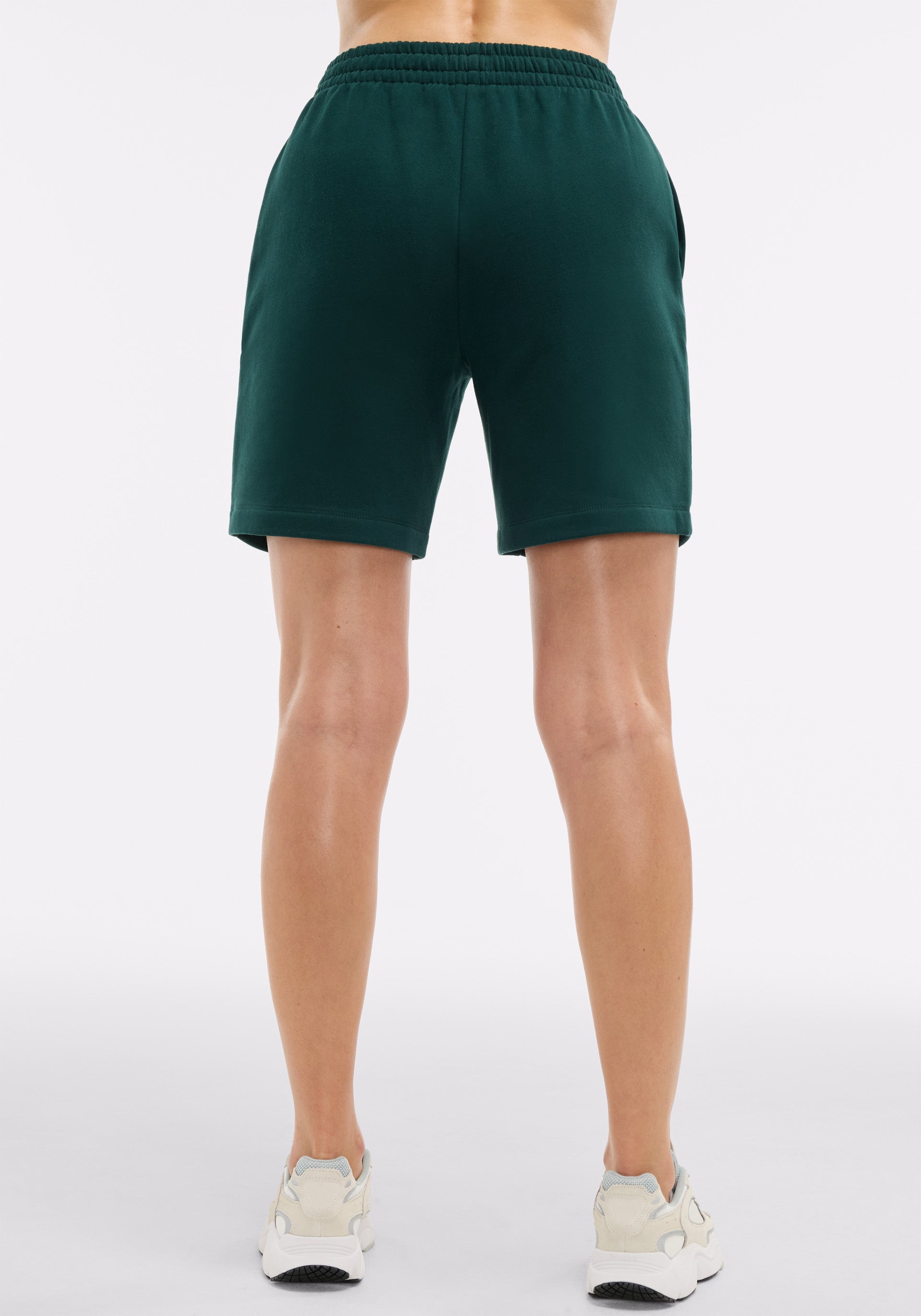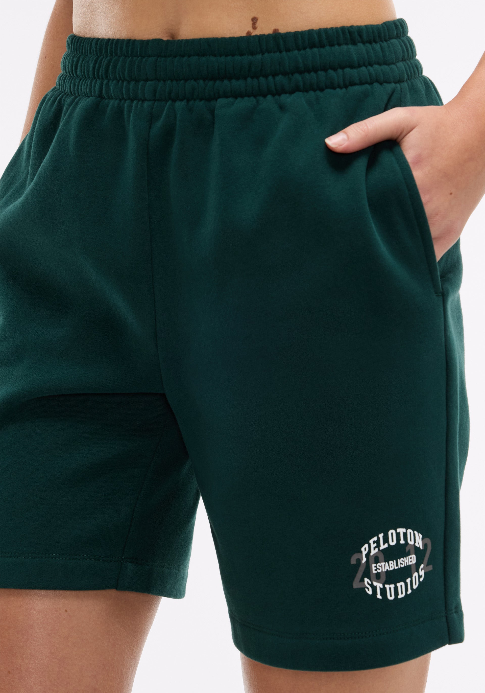 Gender neutral, cotton fleece sweatshort with side pockets and elastic waistband with interior drawcord
