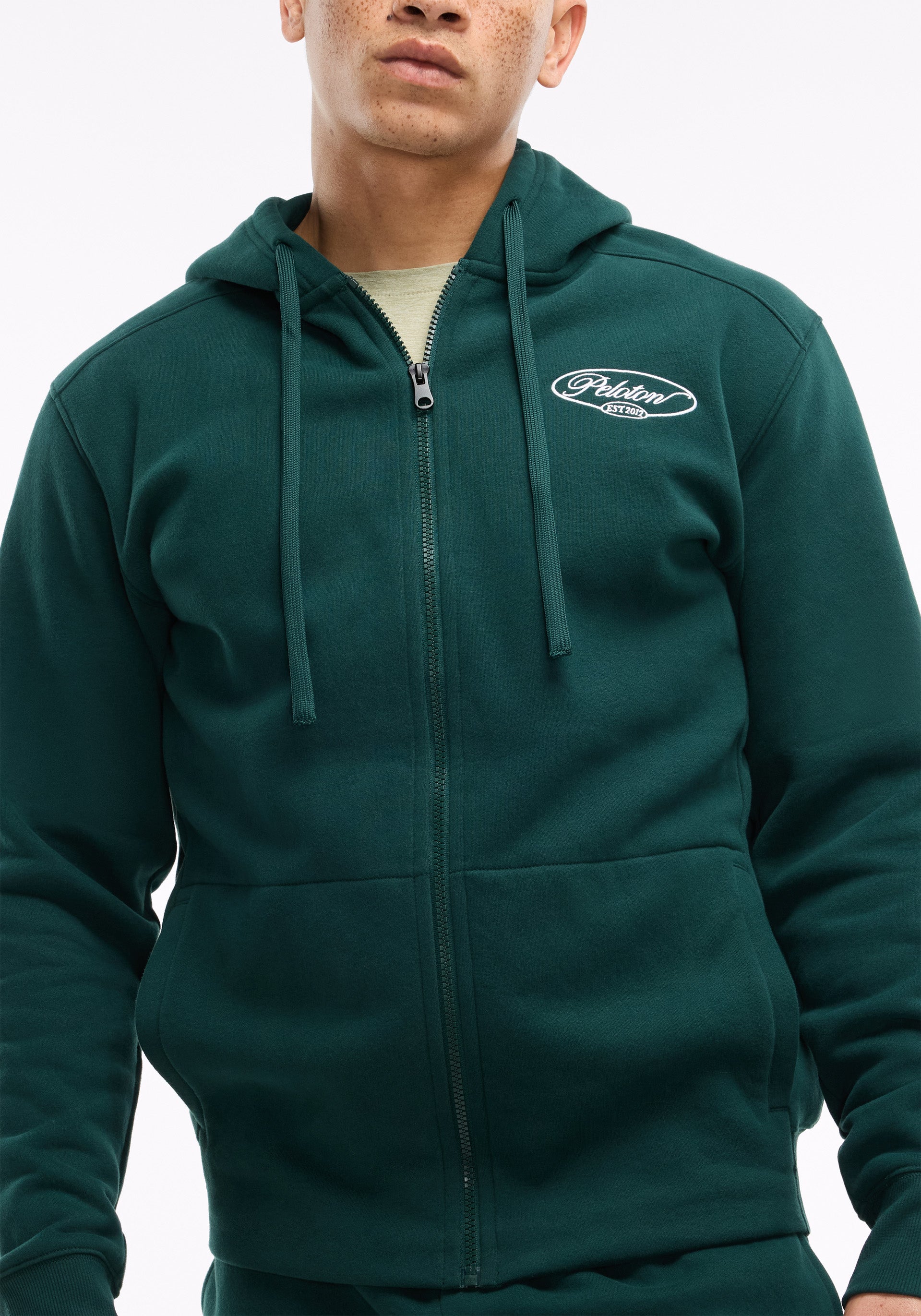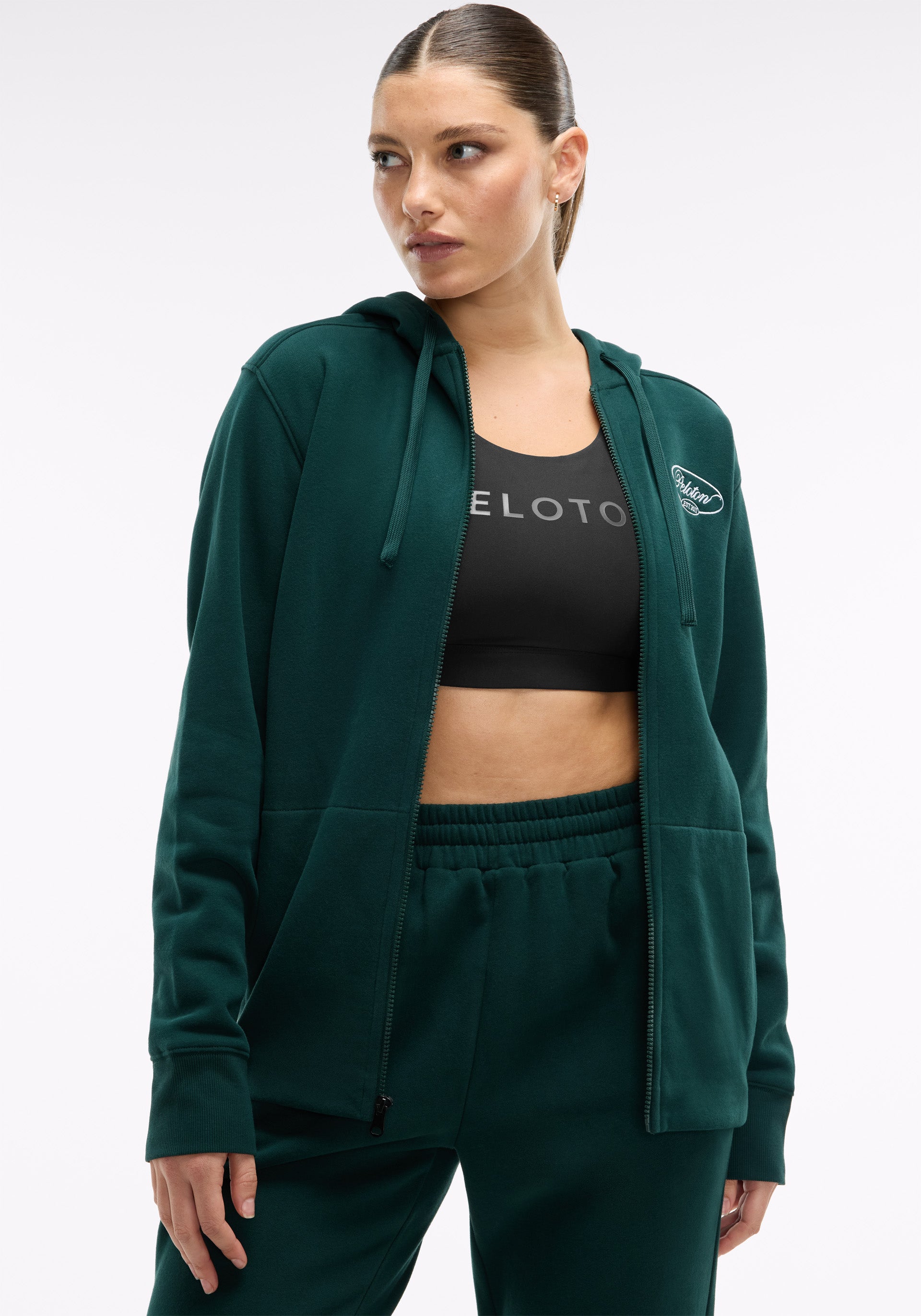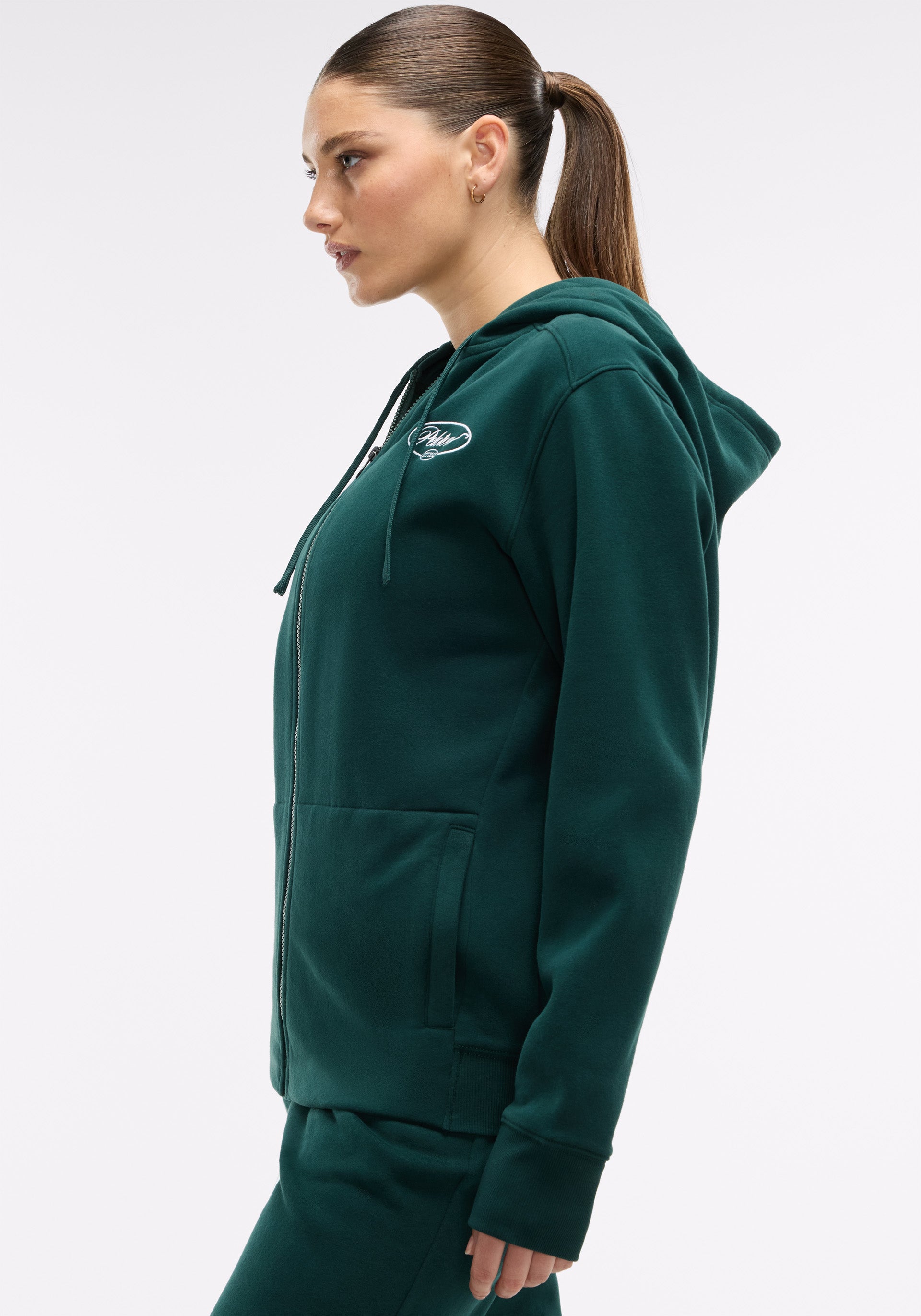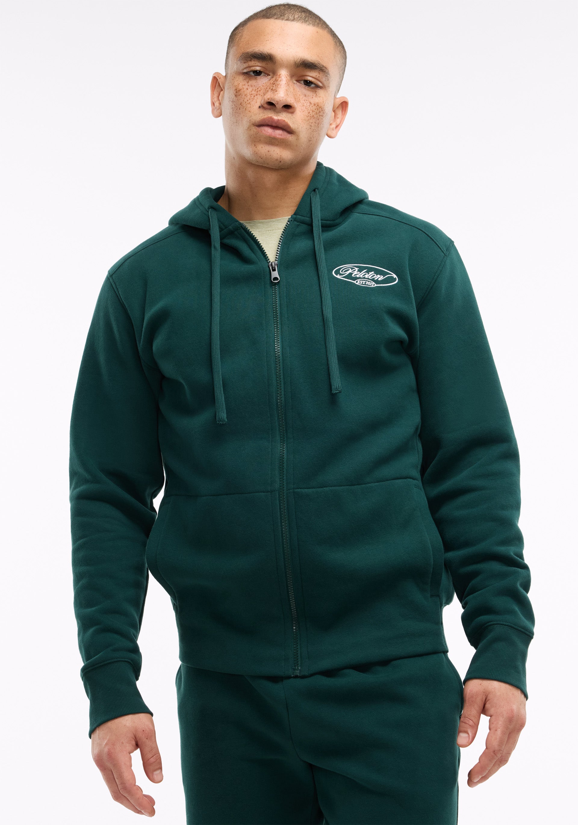 Gender neutral, cotton fleece full zip with rib cuff and hem, hood drawcord, and side pockets
