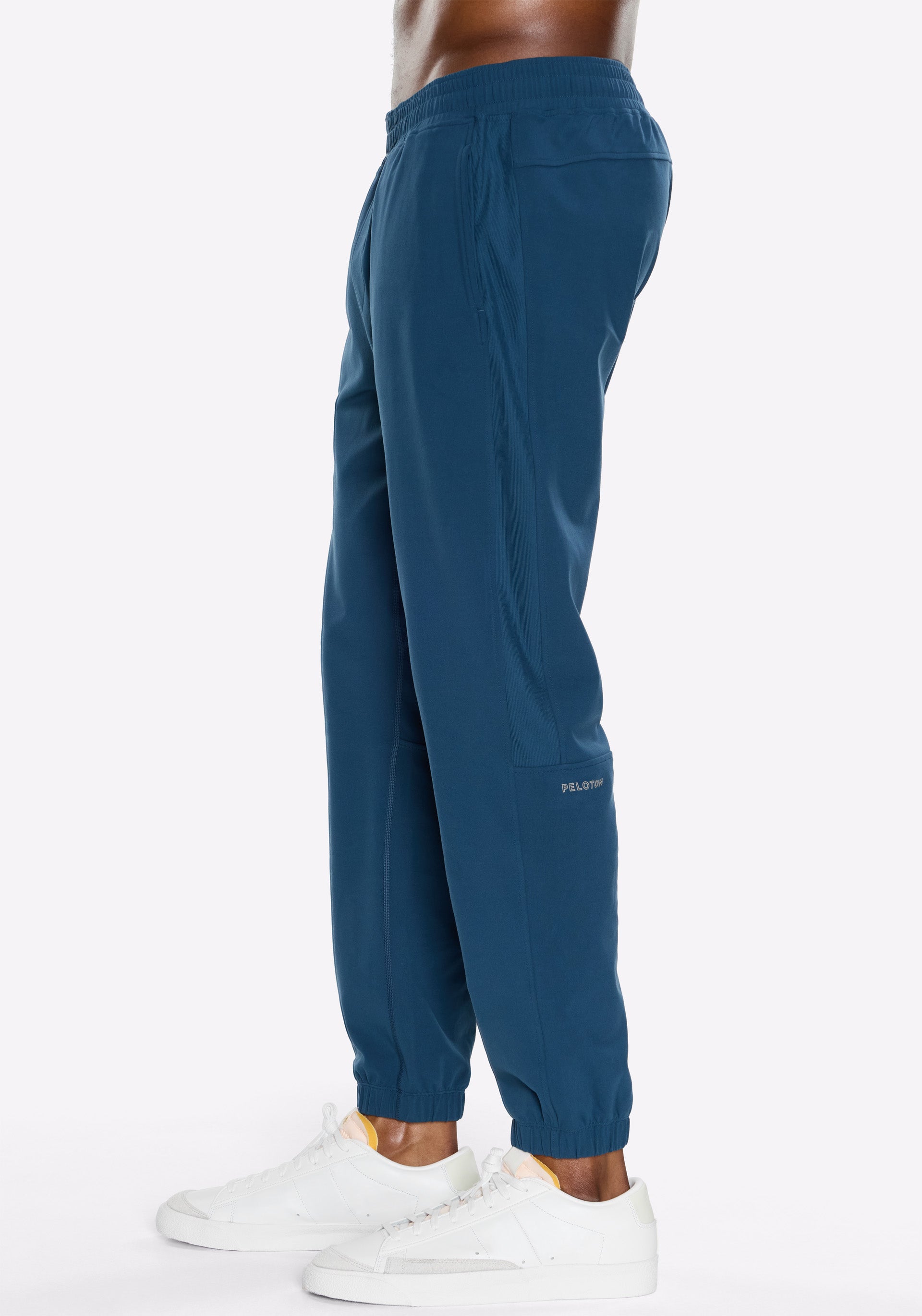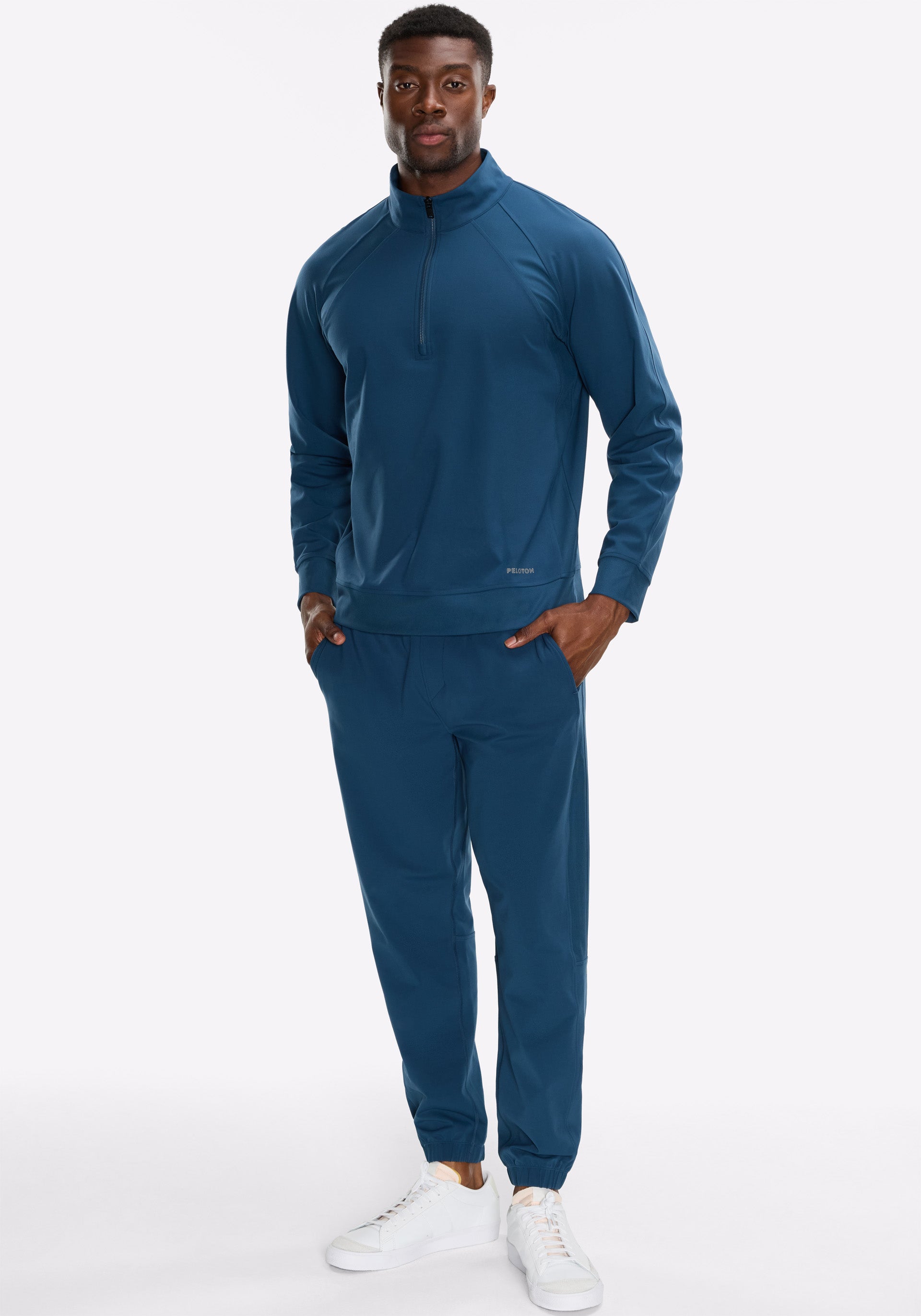 Classic jogger with rib detailing at side seam, faux fly, elastic waistband, interior drawcord, side pockets, and back zip pocket