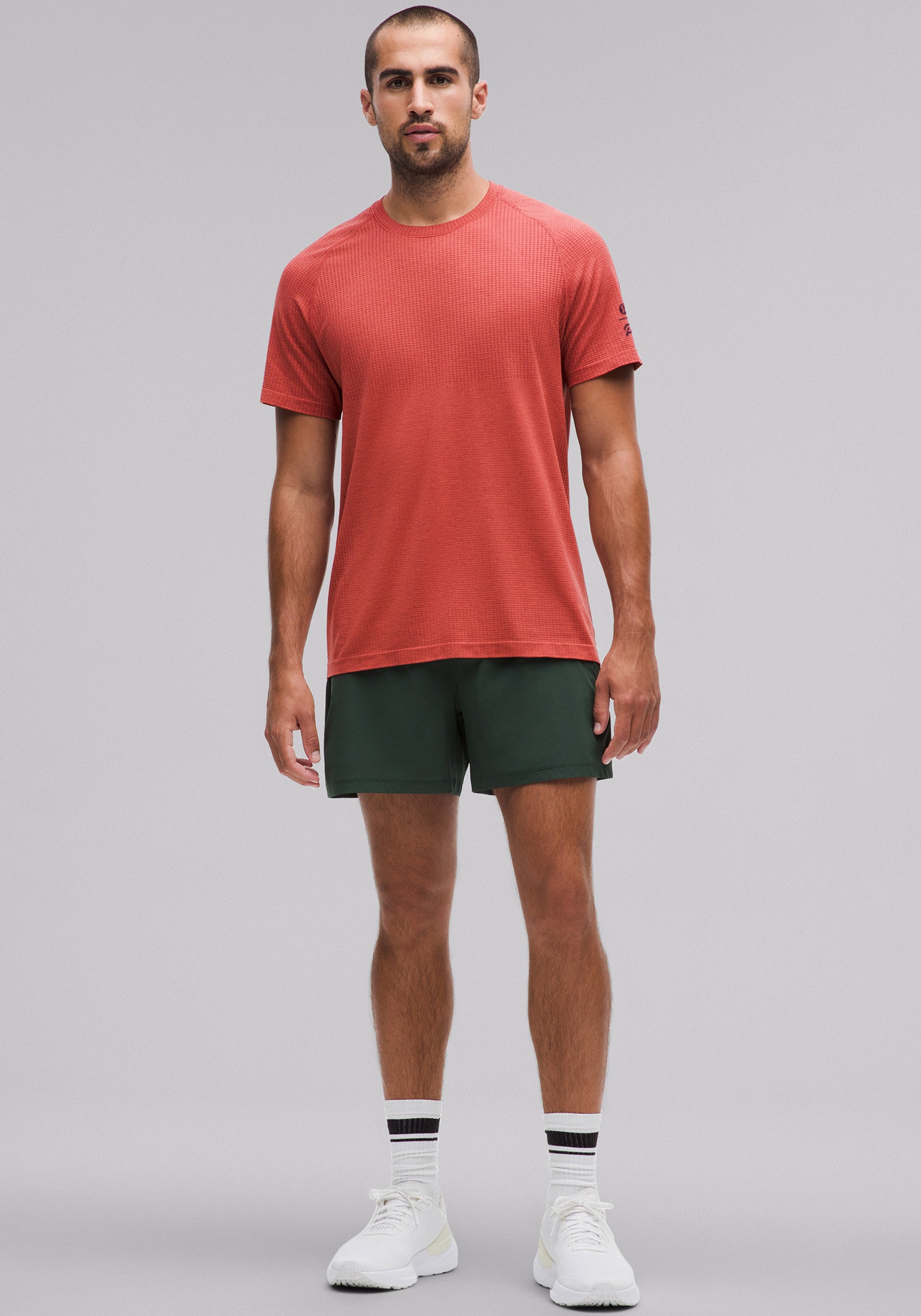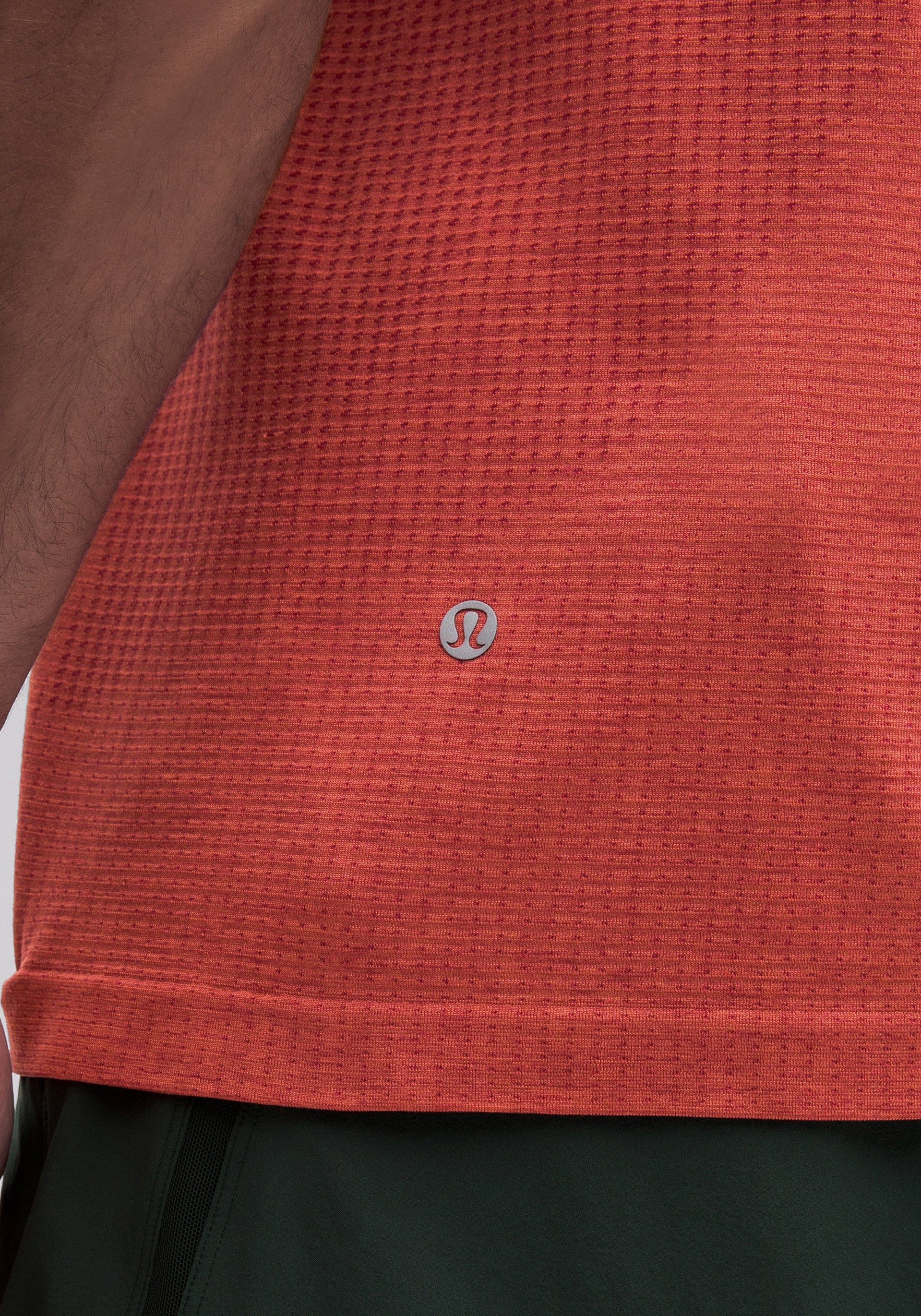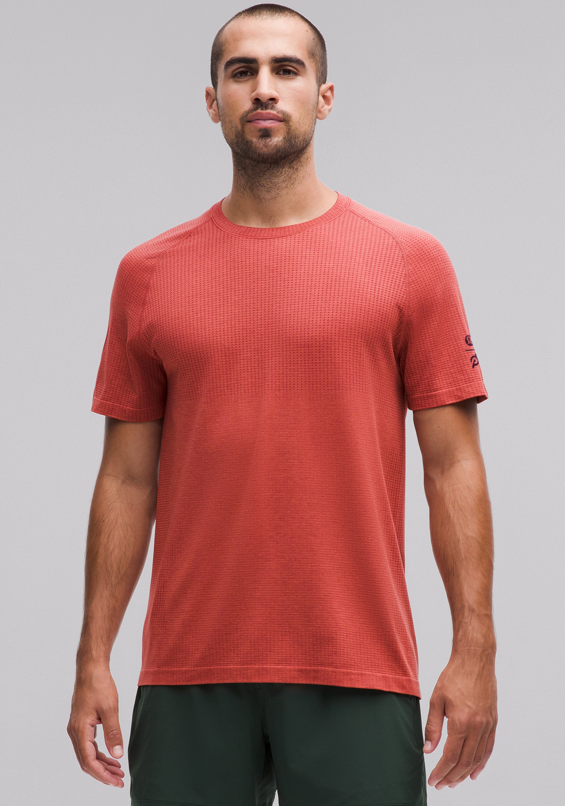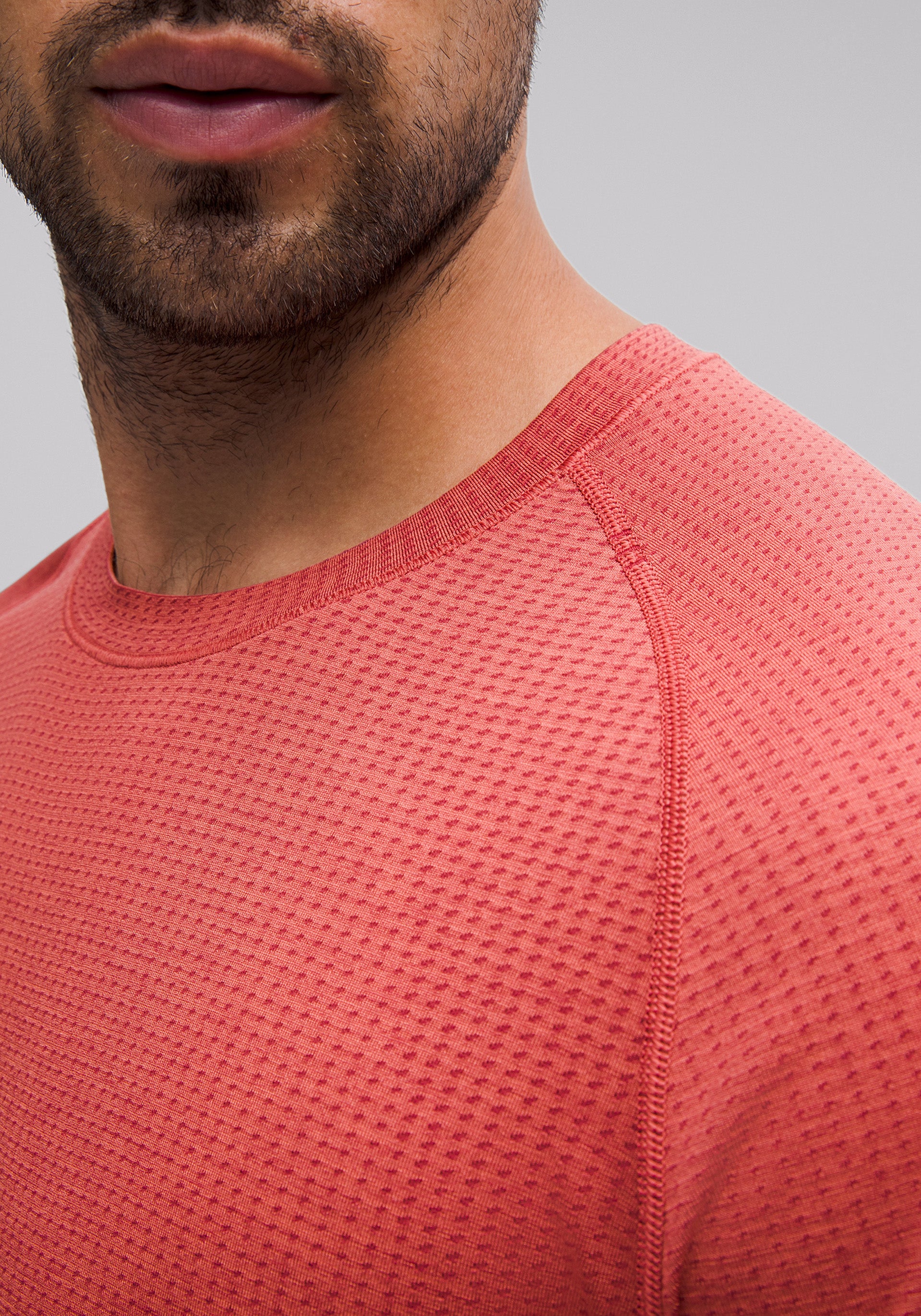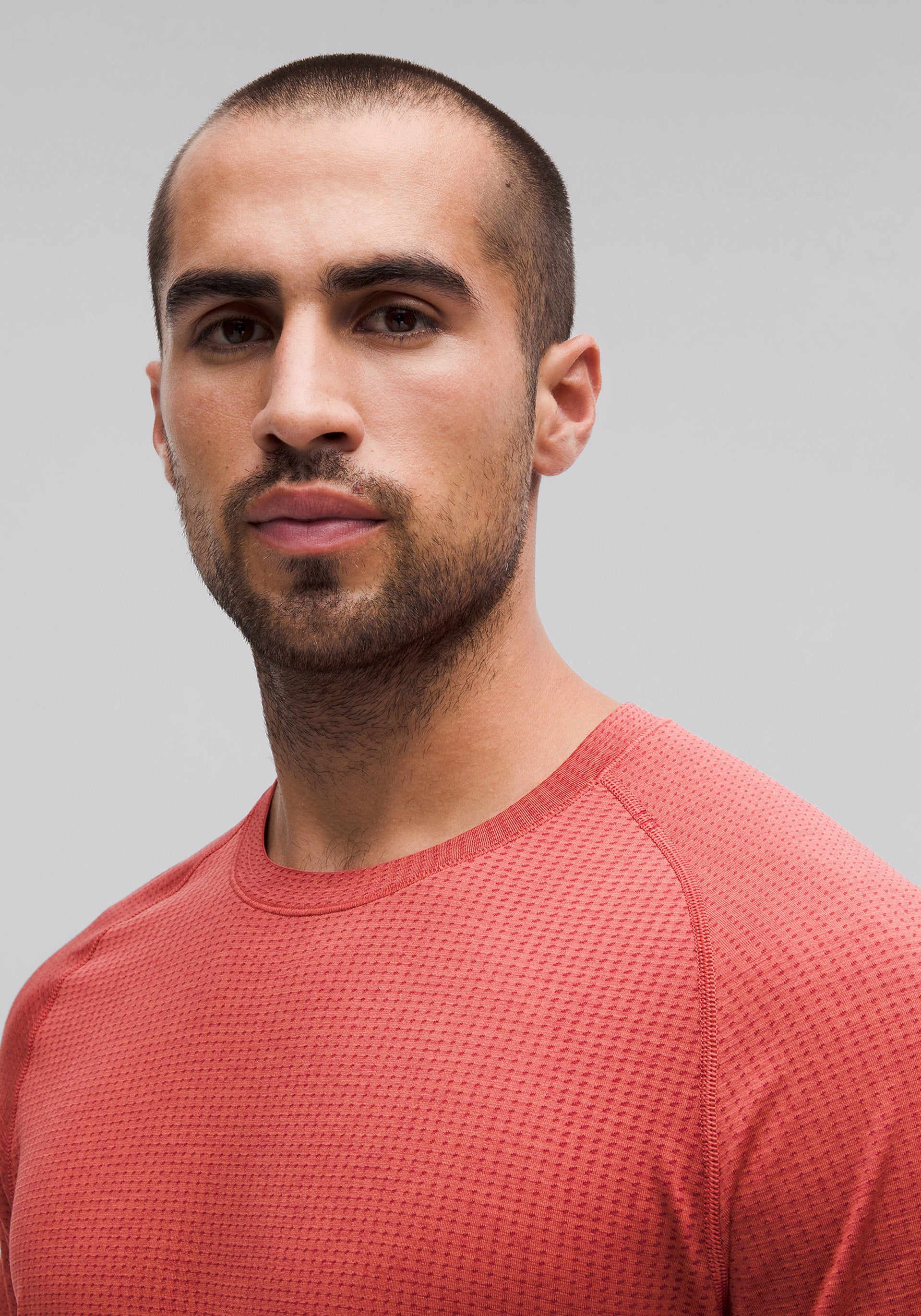 Crewneck, short sleeve with no side seams so you can skip the chafe and a rebalanced fabric and fit for less cling on sweaty skin