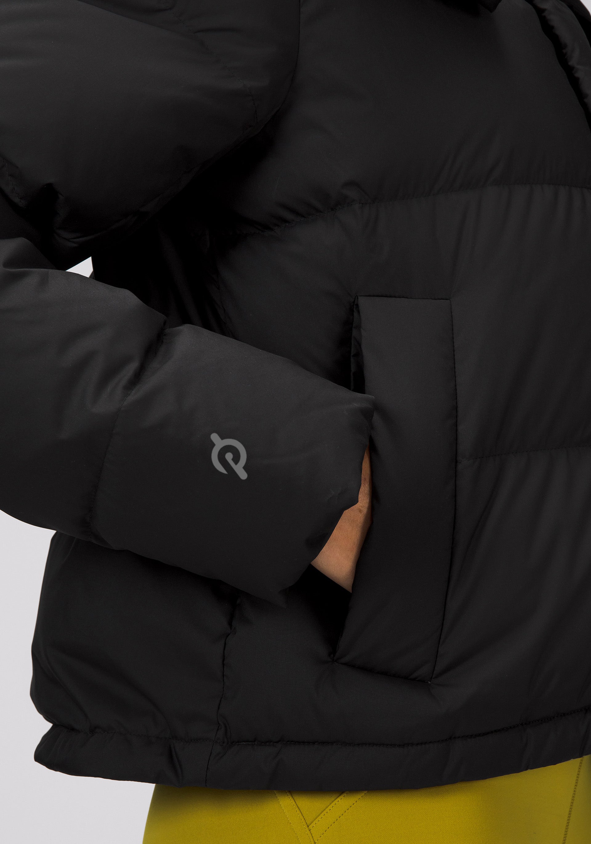 Puffer jacket with removable hood, cinchable hem, zippered hand pockets with a hidden phone sleeve, and interior pockets to hold the essentials