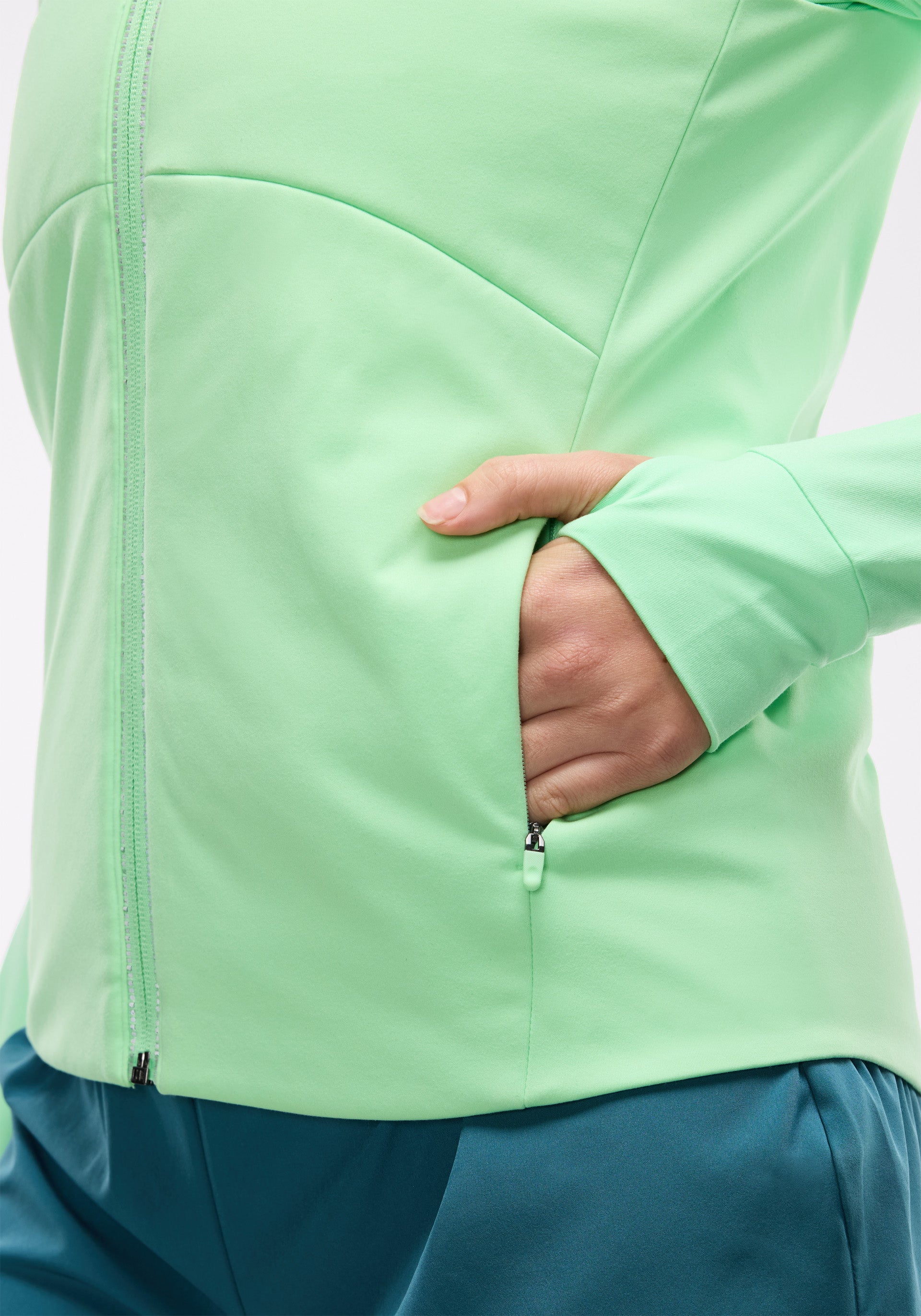 Padded vest with reflective style lines and zipper, side zip pockets, and interior mesh pockets
