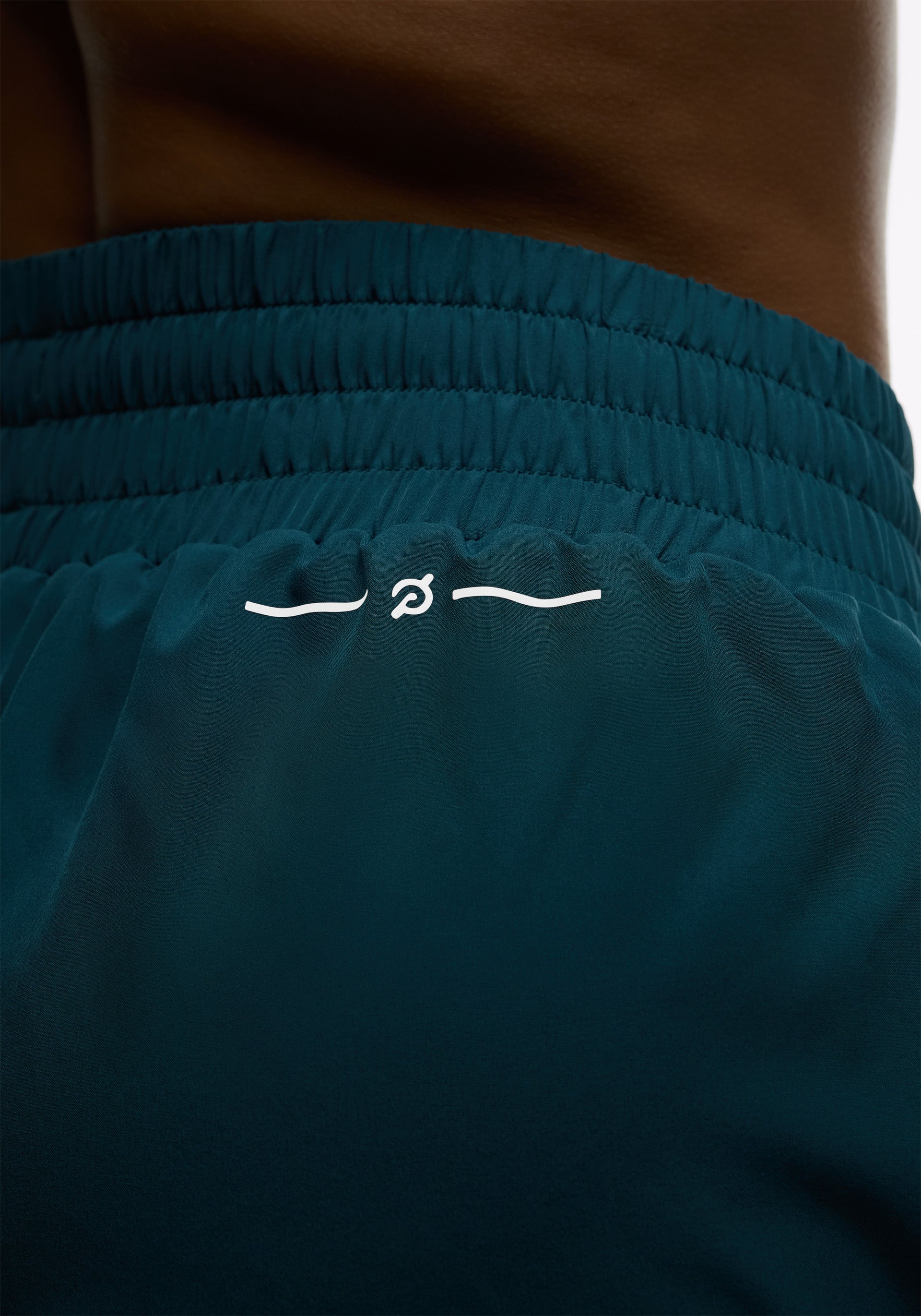 High rise, 3" inseam run short with wide encased elastic waistband, interior drawcord, and brief liner