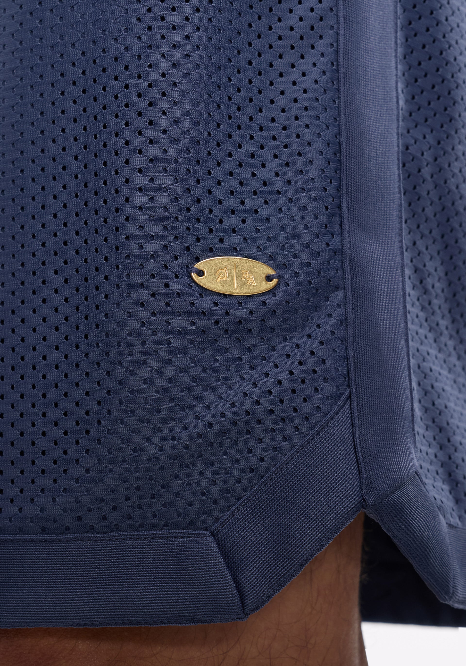 • 7” inseam, unlined short with elastic waistband, interior drawcord, side hand pockets, and taping at side seam and bottom hem