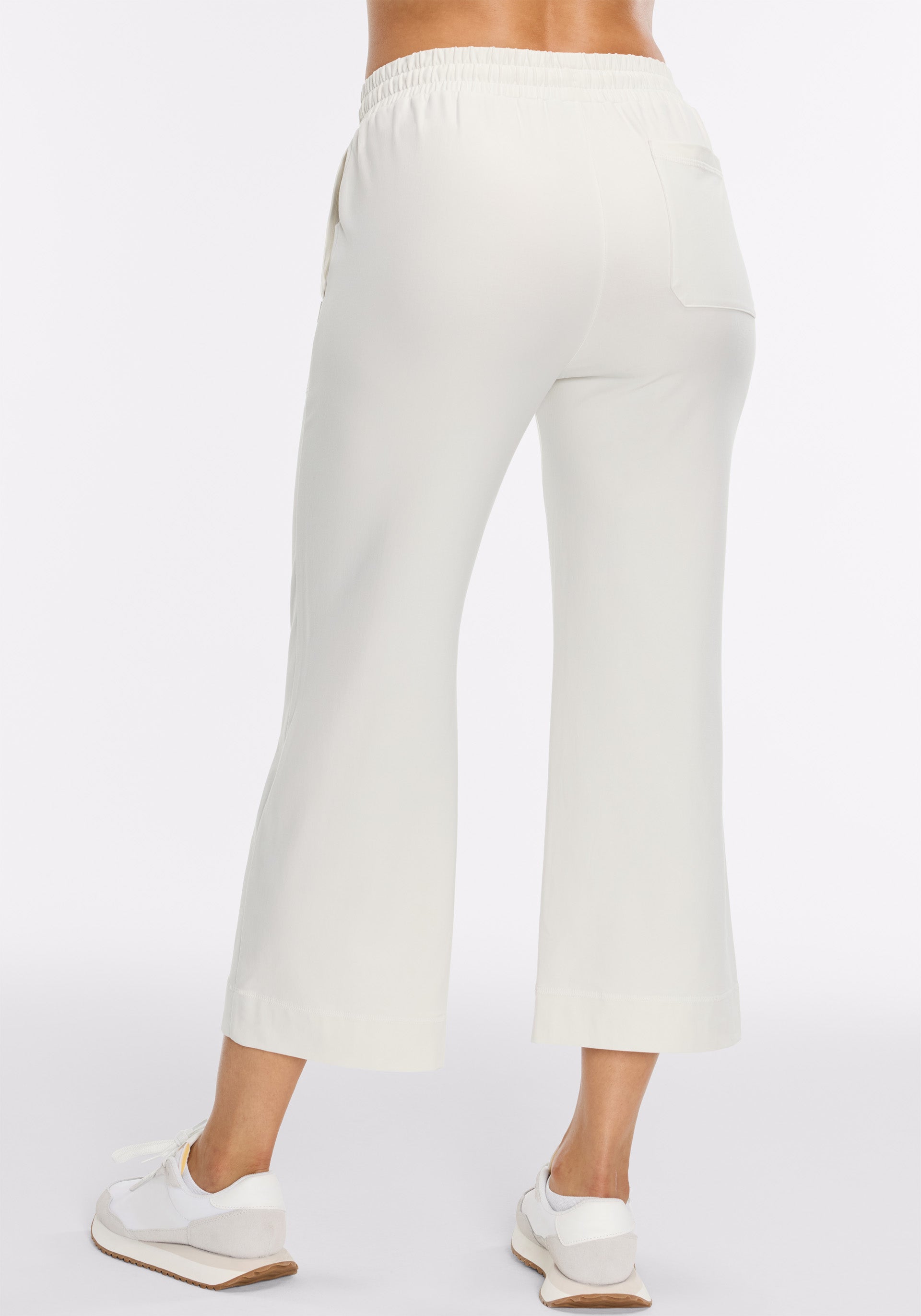 High rise, wide leg pant with side pockets, elastic waistband, exterior drawcord, and back pocket