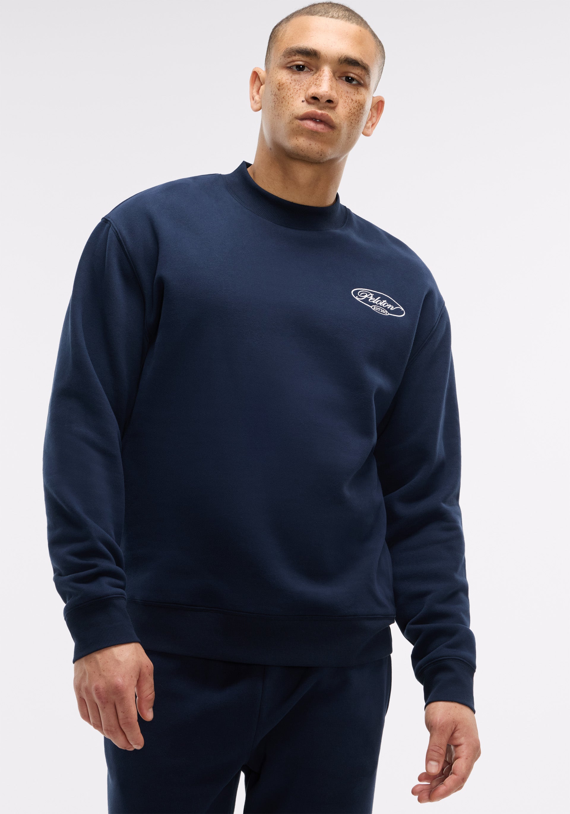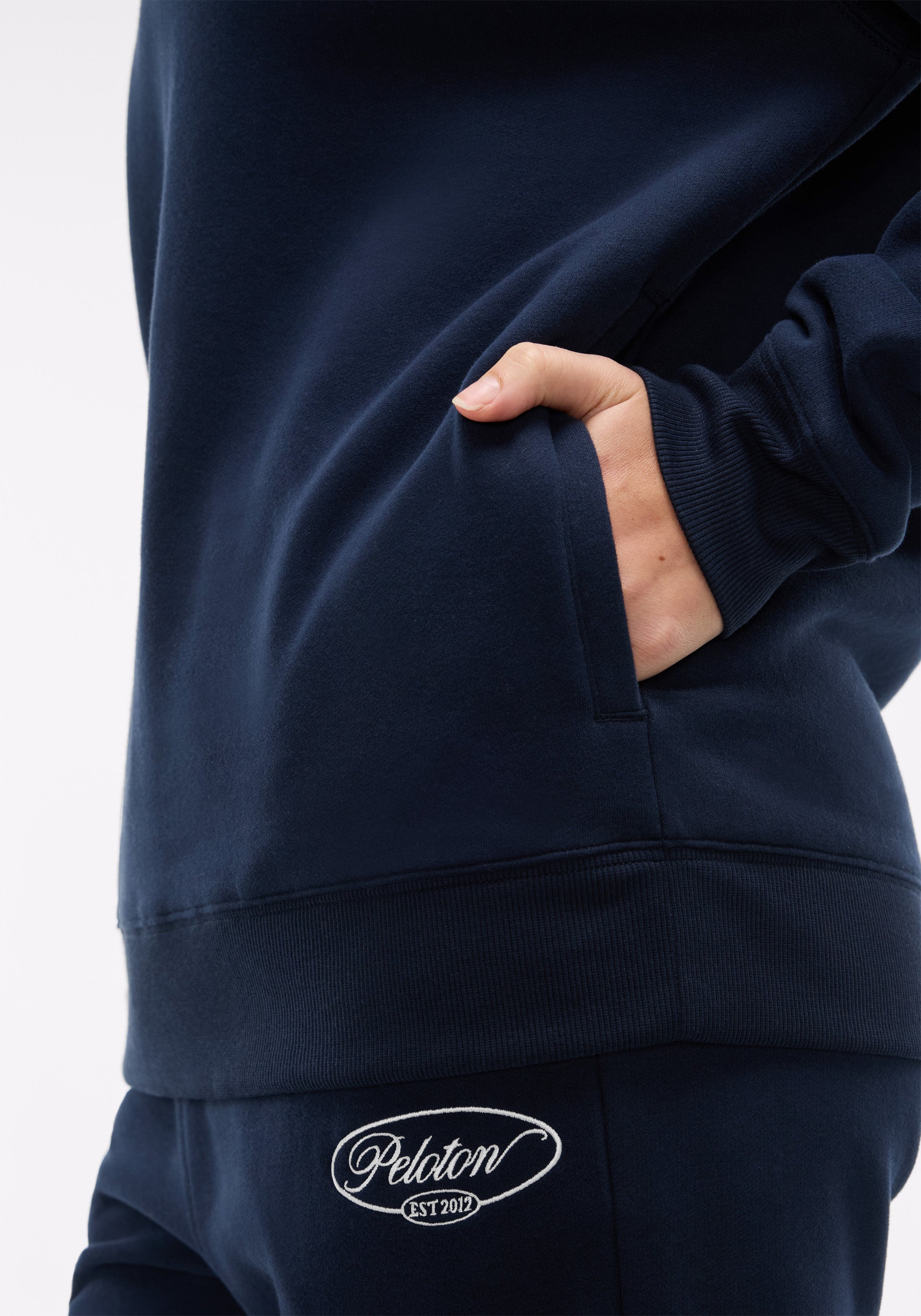 Gender neutral, cotton fleece crewneck with mock neckline, side pockets, and rib detailing at neck, cuff, and hem