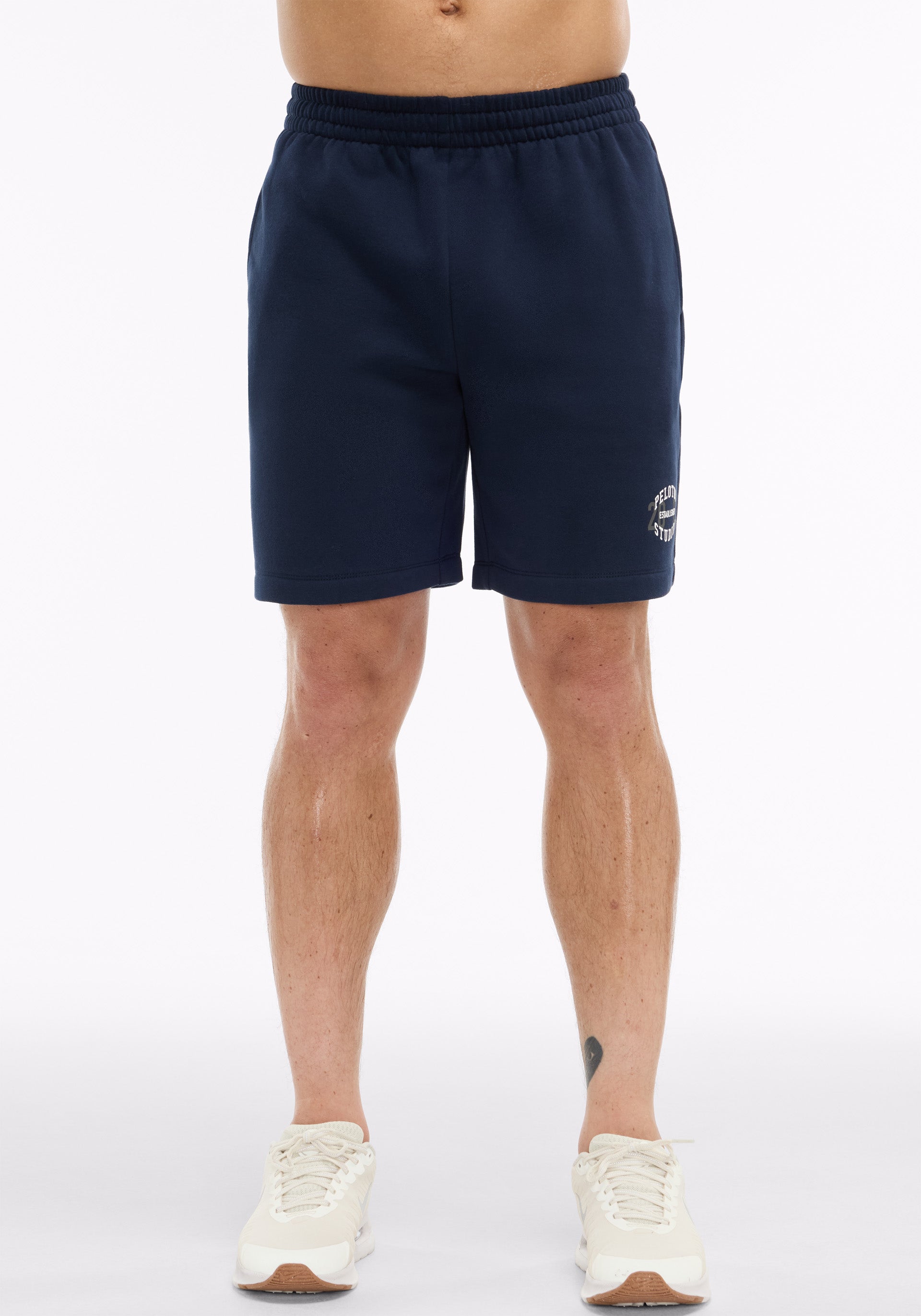 Gender neutral, cotton fleece sweatshort with side pockets and elastic waistband with interior drawcord