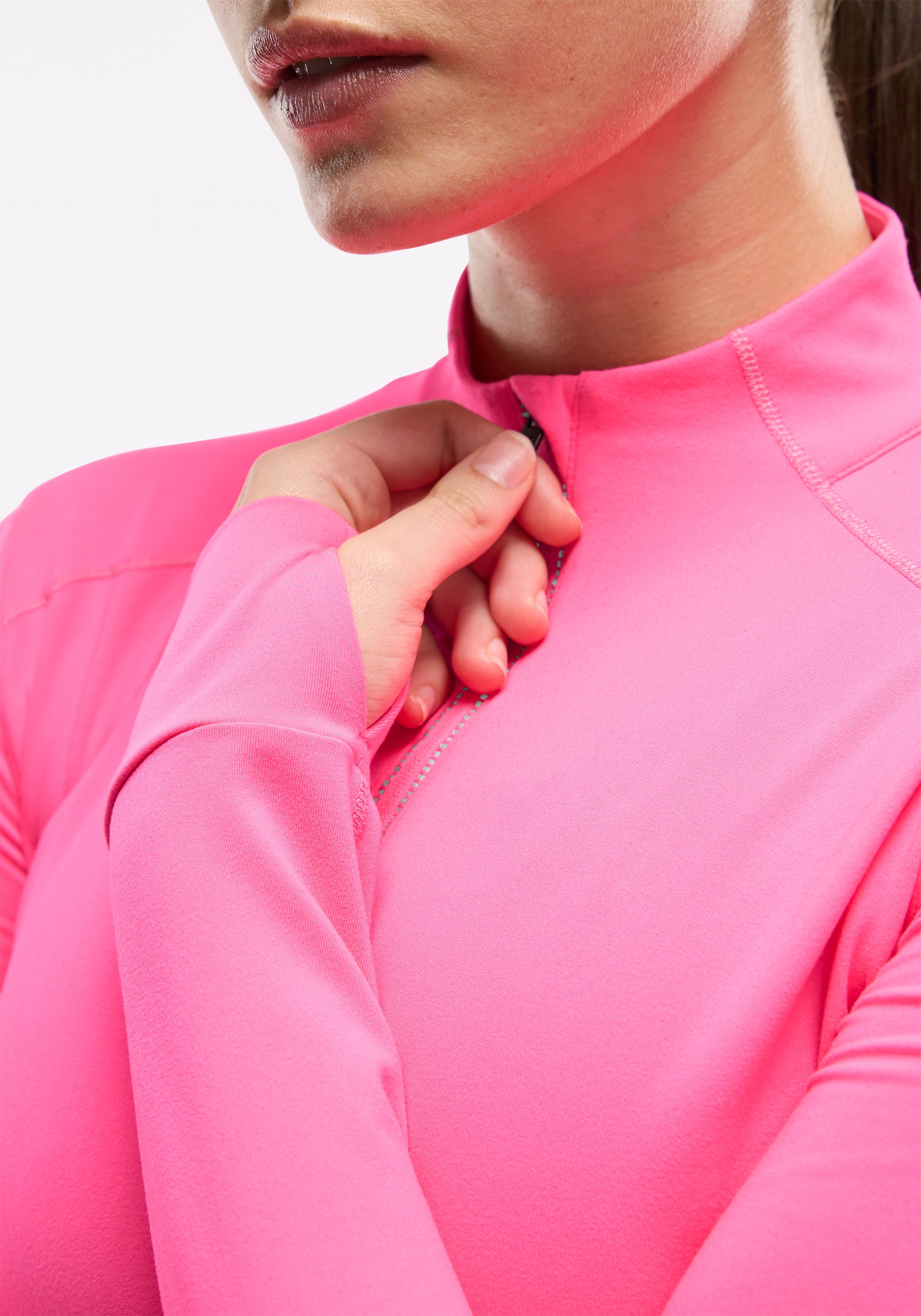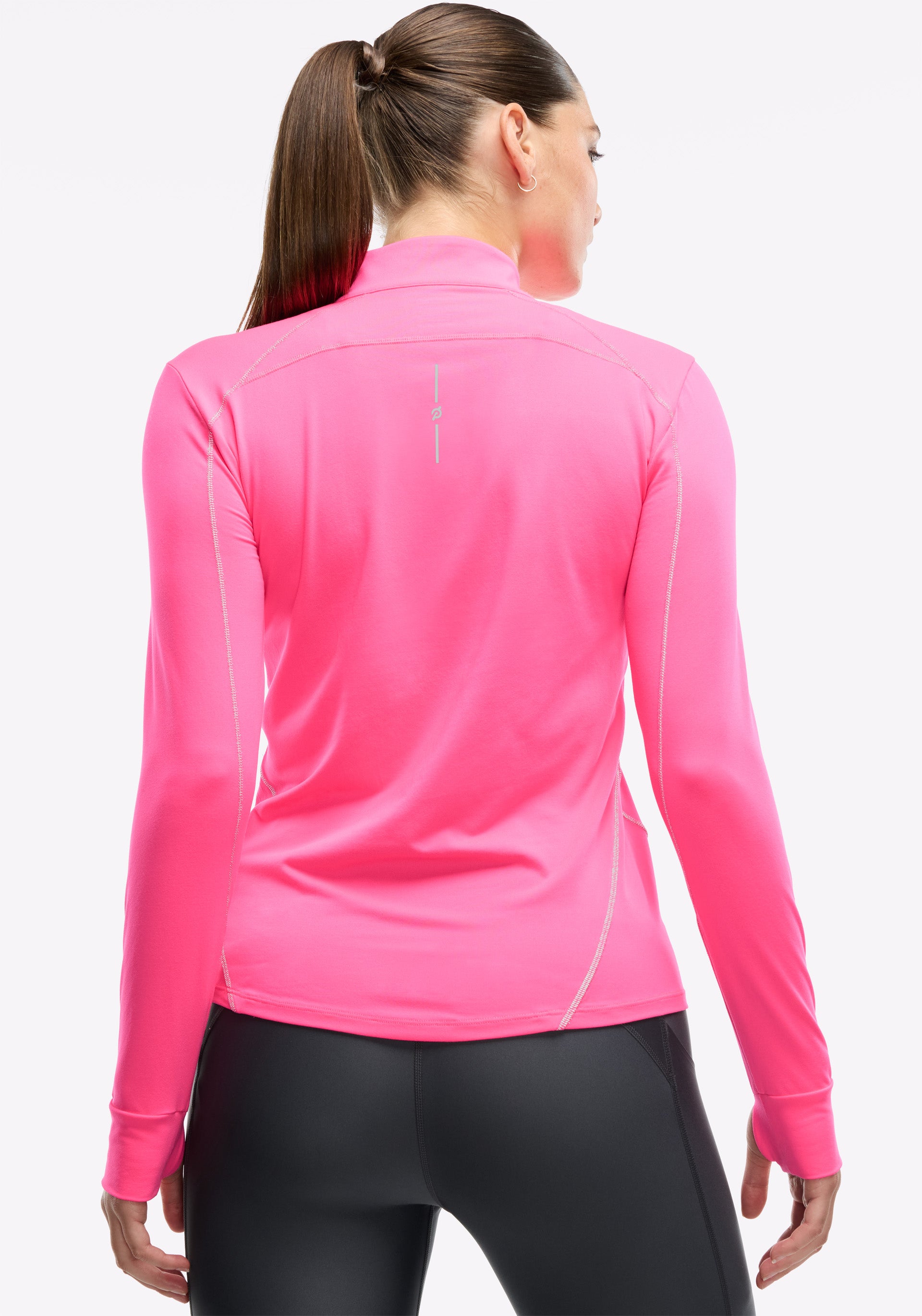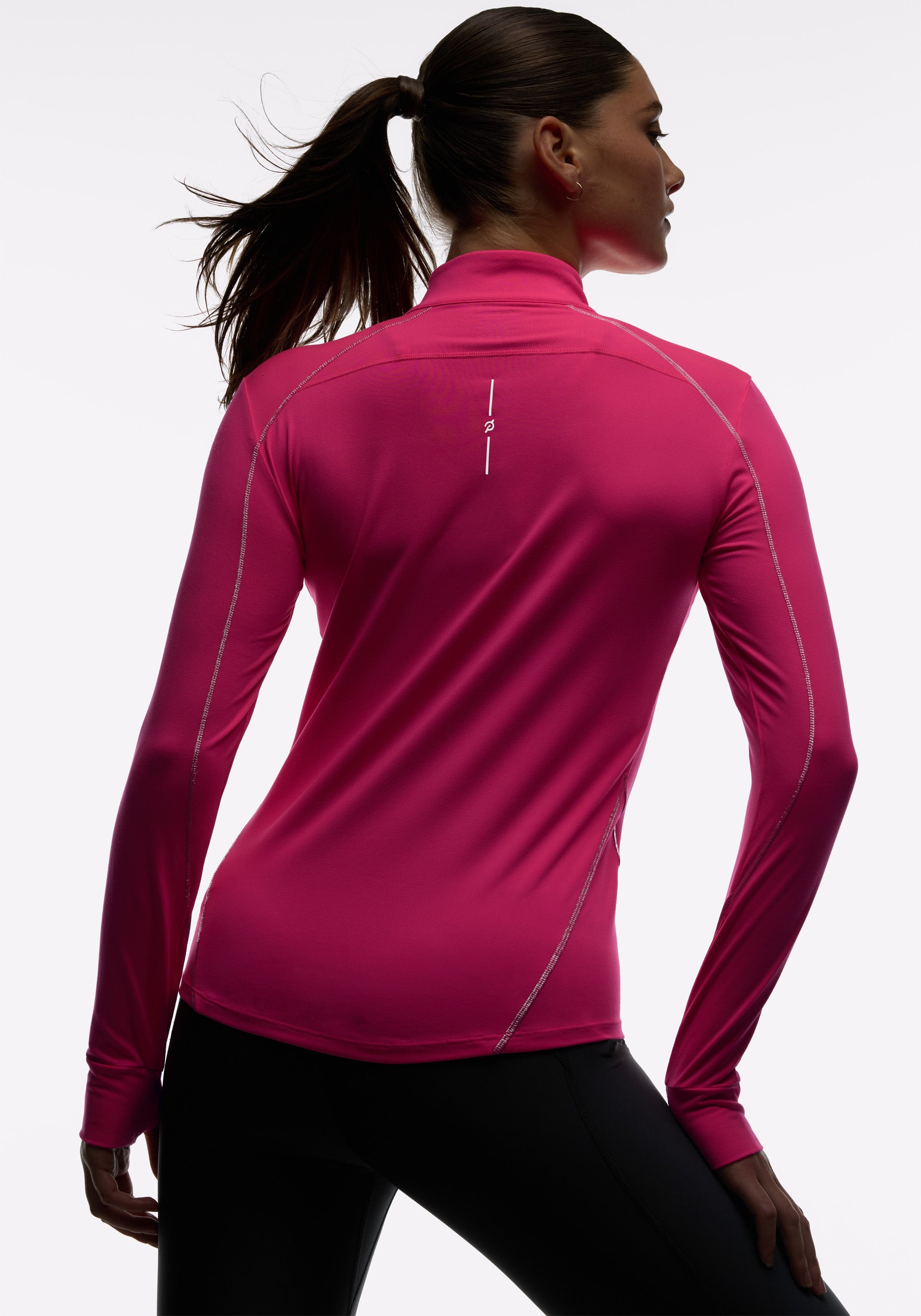 • Mock neck quarter zip with reflective zipper placket, thumbholes, and reflective contrast style lines