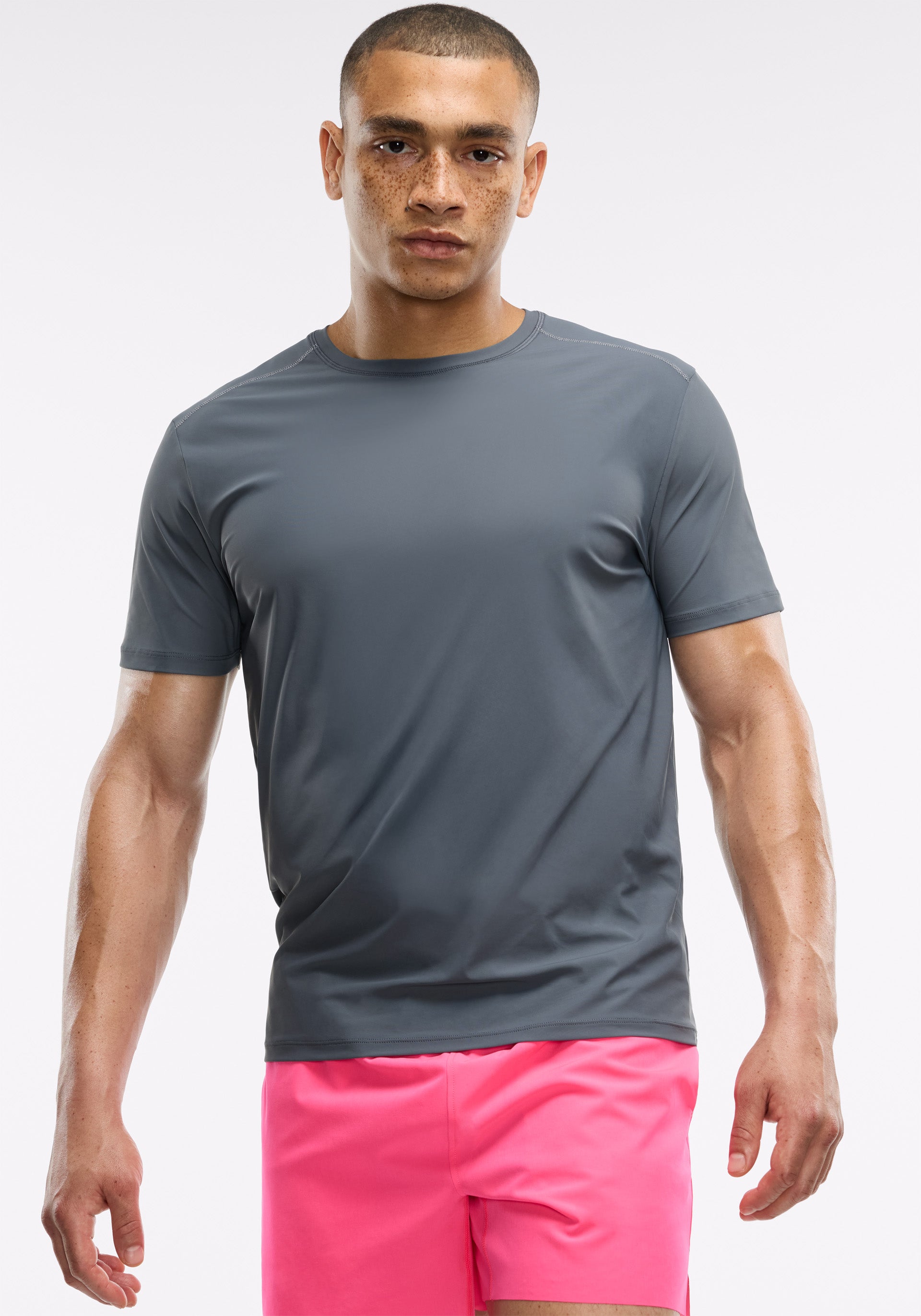 • Crewneck short sleeve with reflective thread style lines and shoulder piece detailing