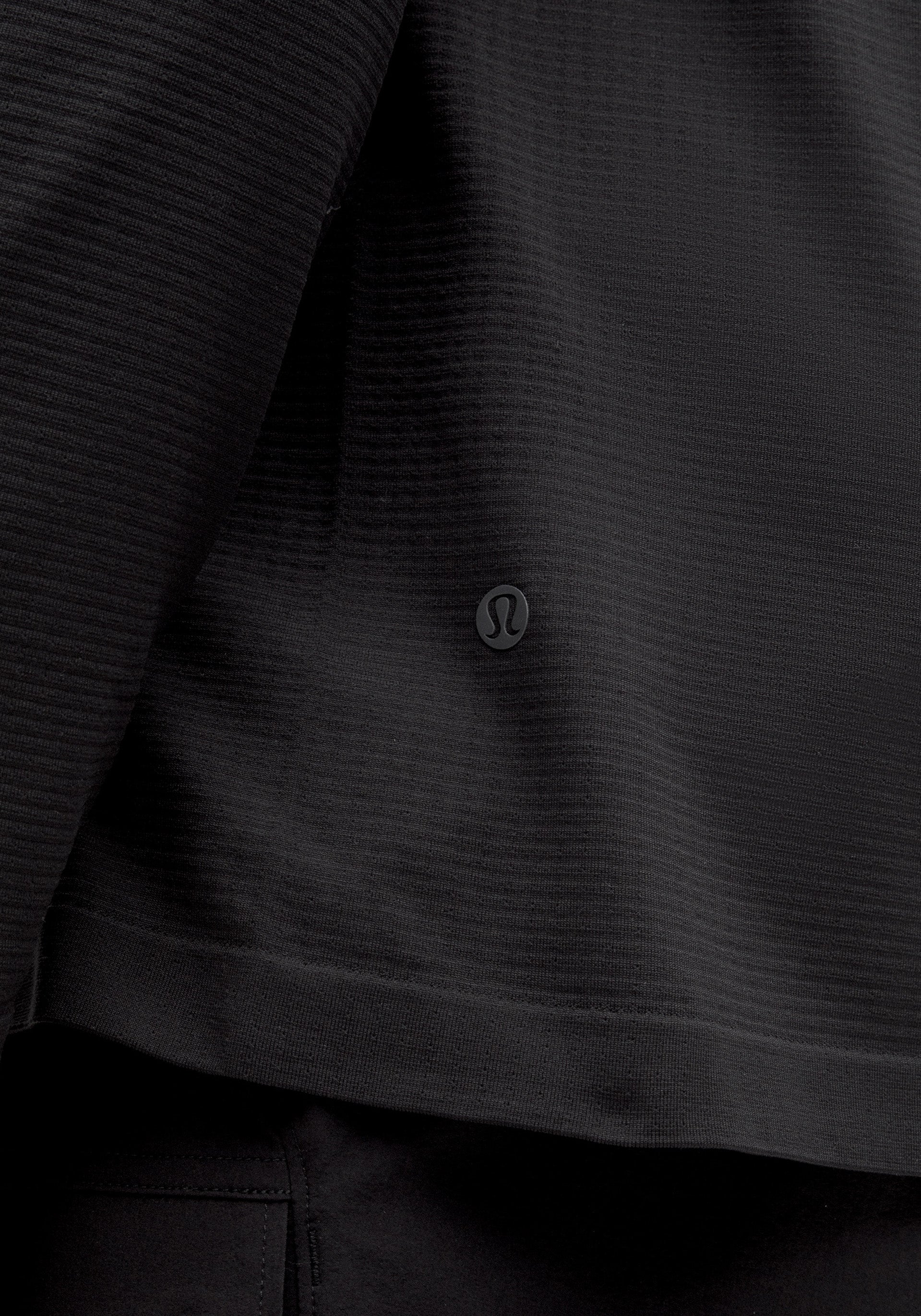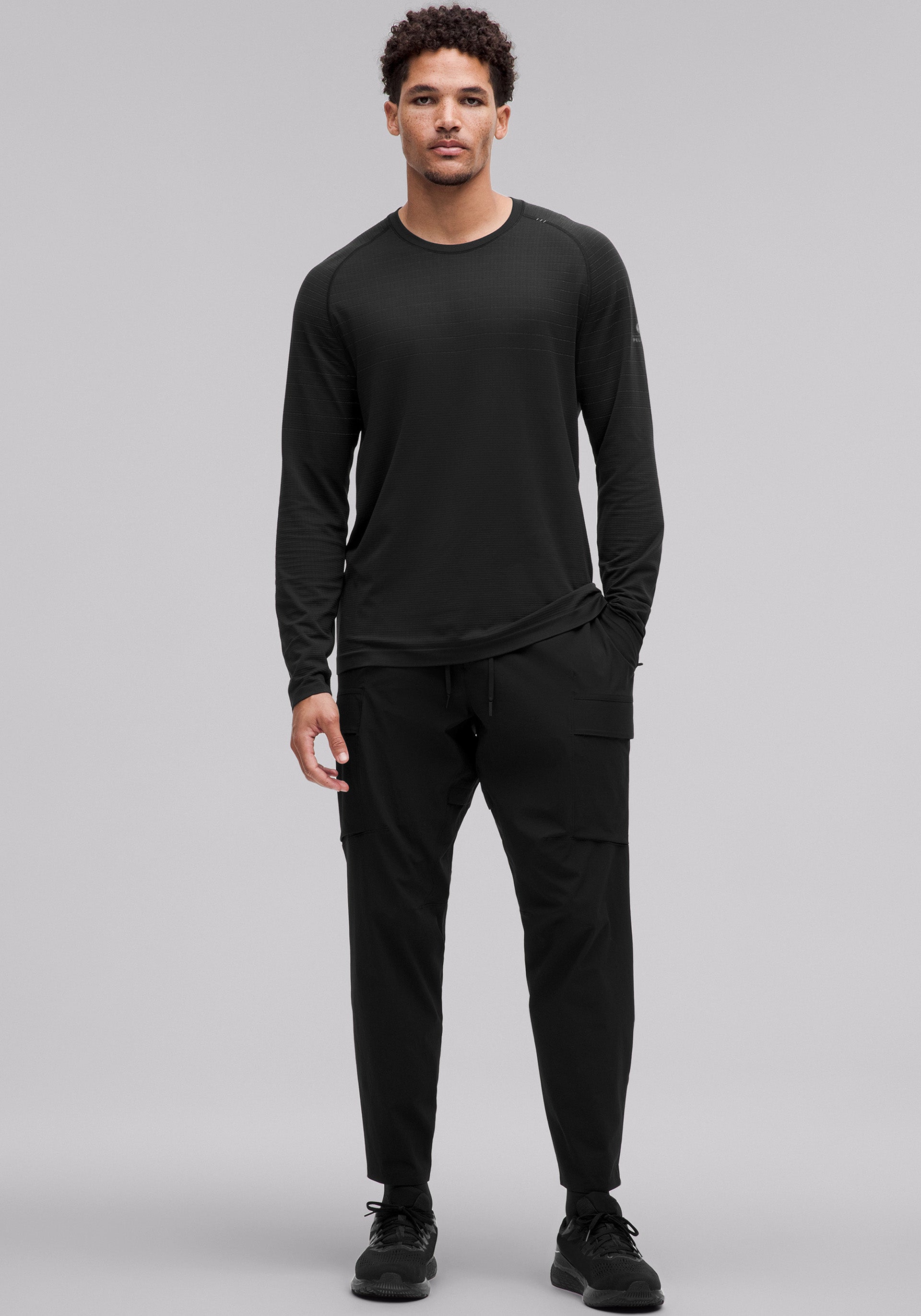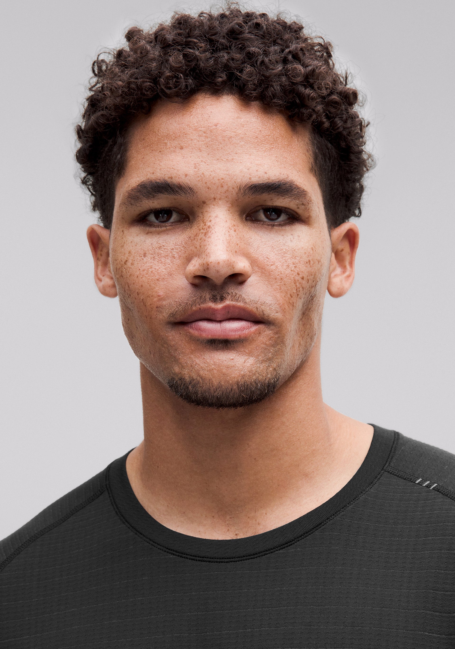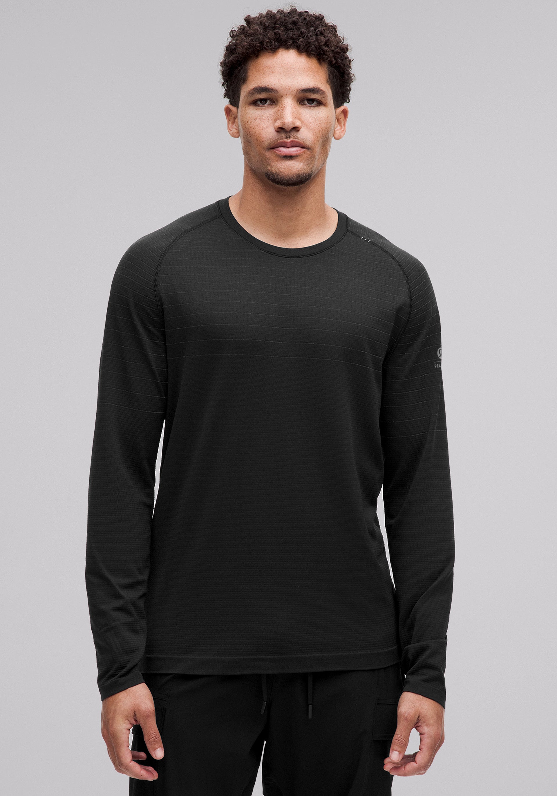 Crewneck, long sleeve with no side seams so you can skip the chafe and a rebalanced fabric and fit for less cling on sweaty skin