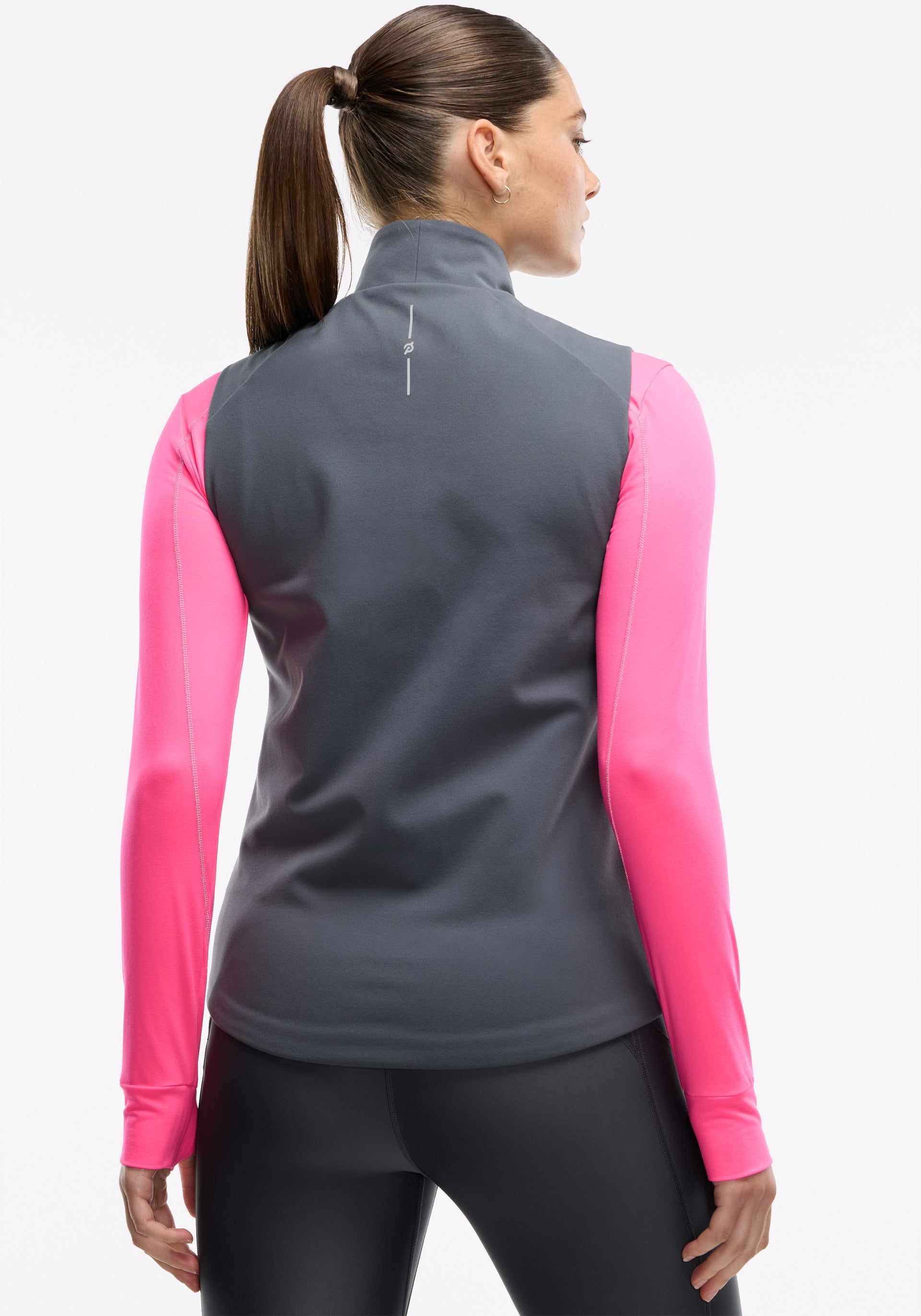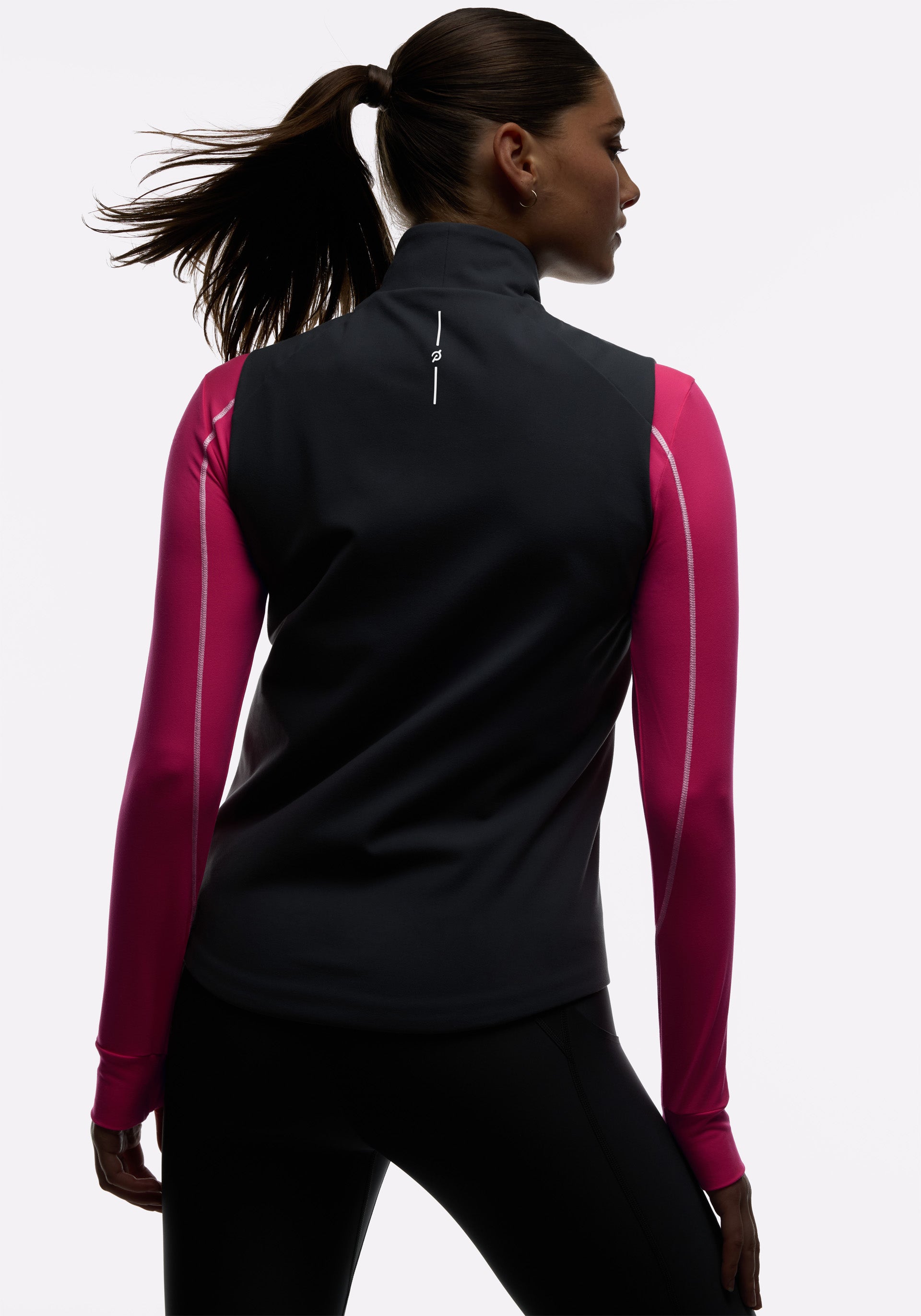 Padded vest with reflective style lines and zipper, side zip pockets, and interior mesh pockets
