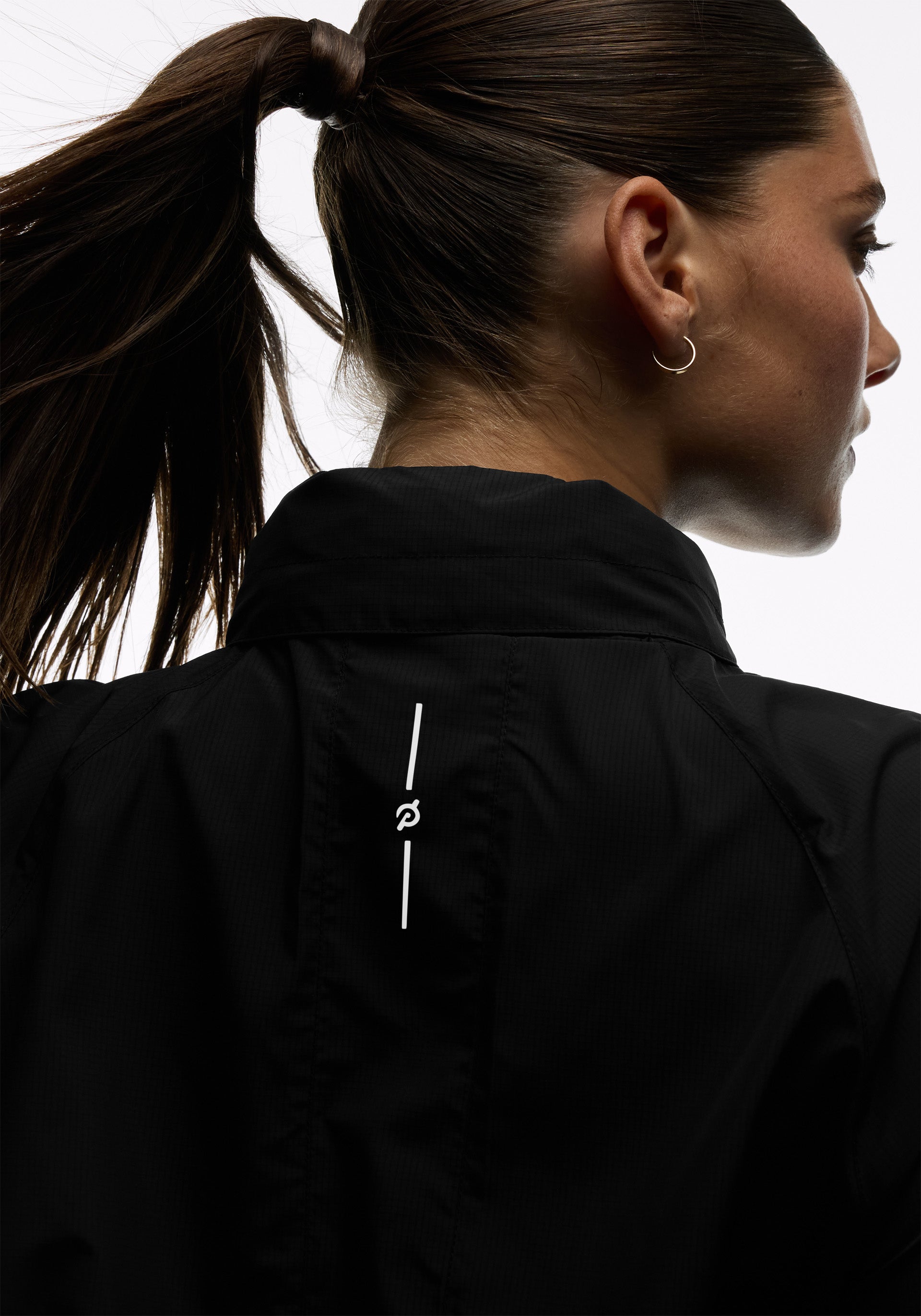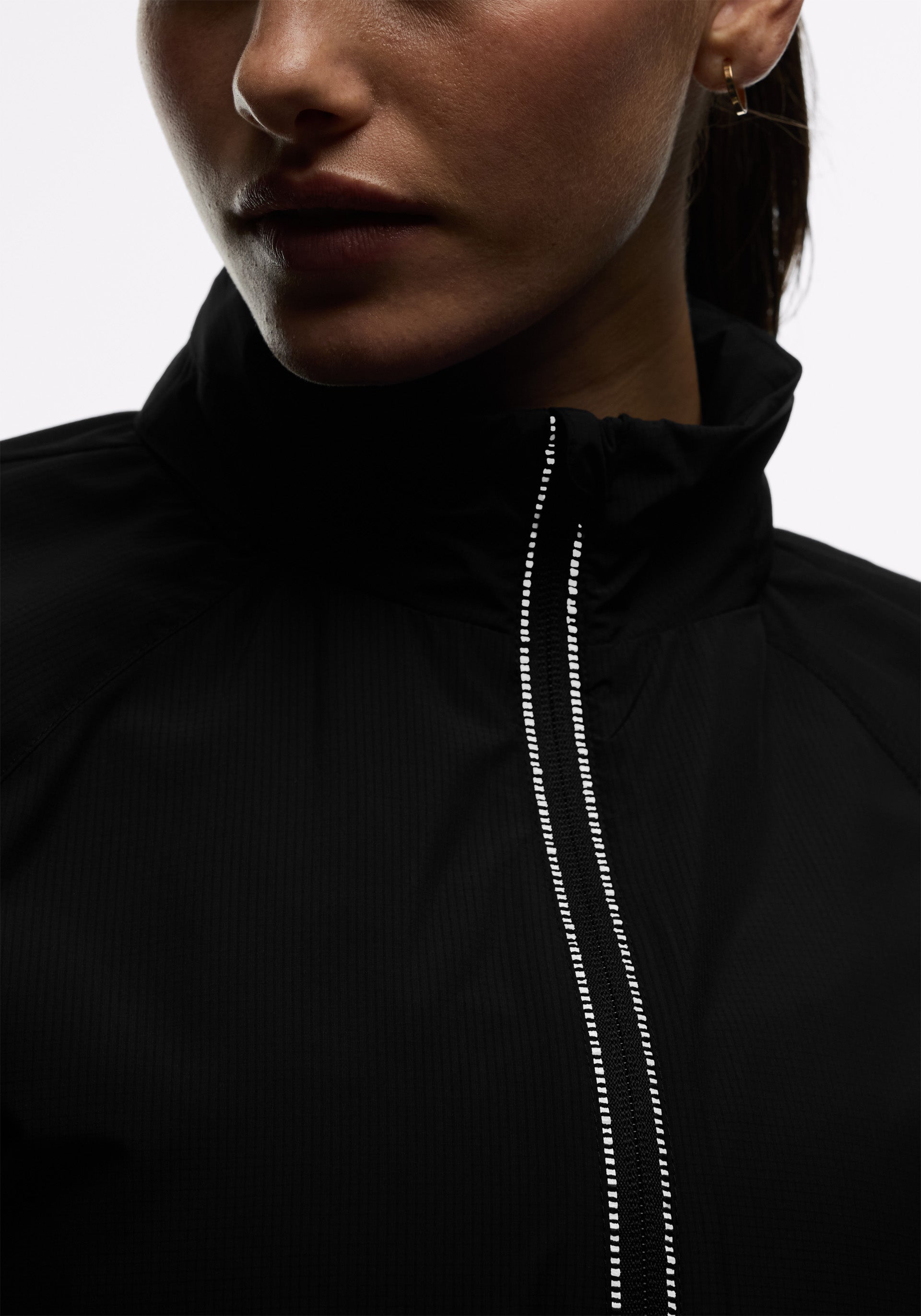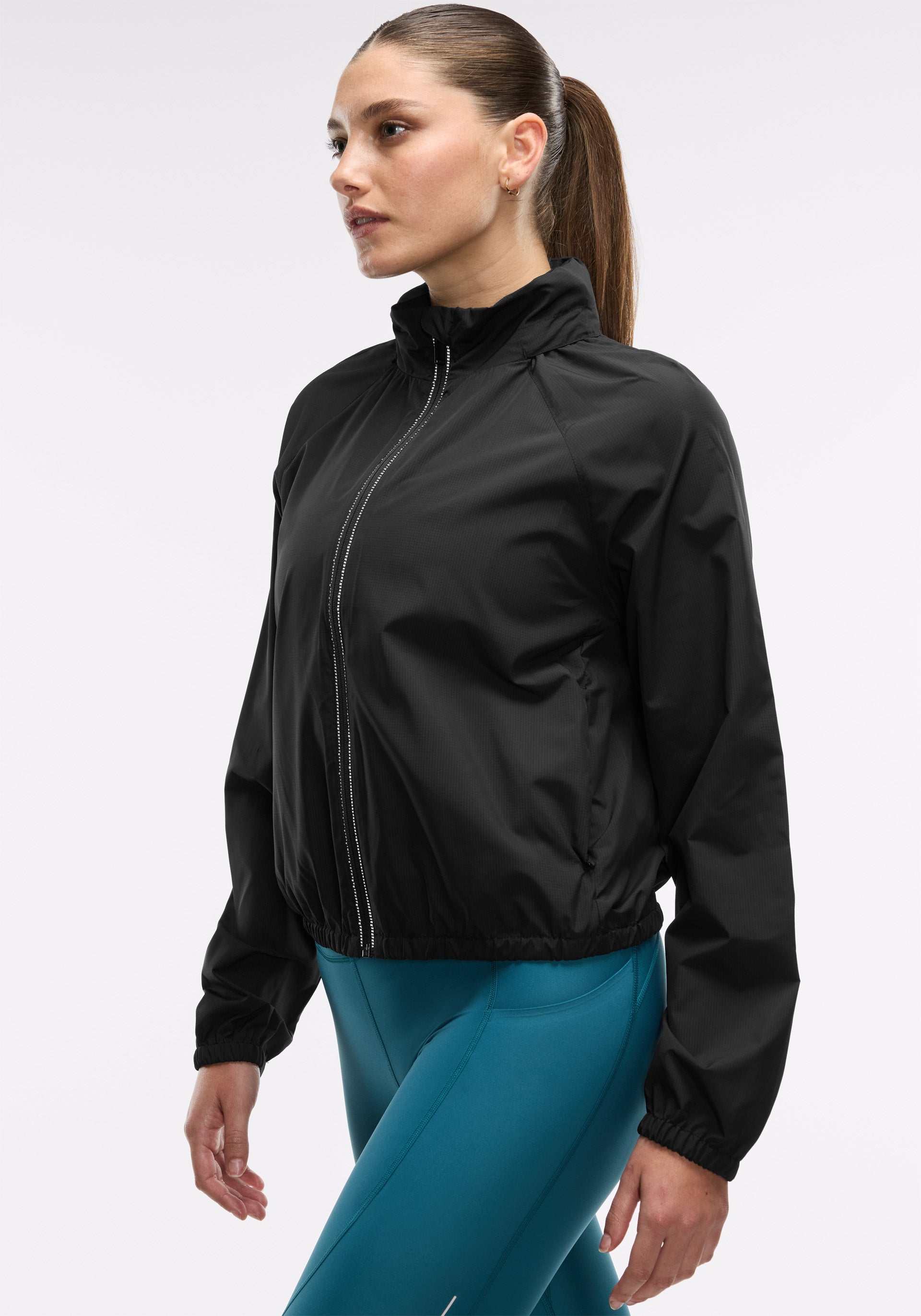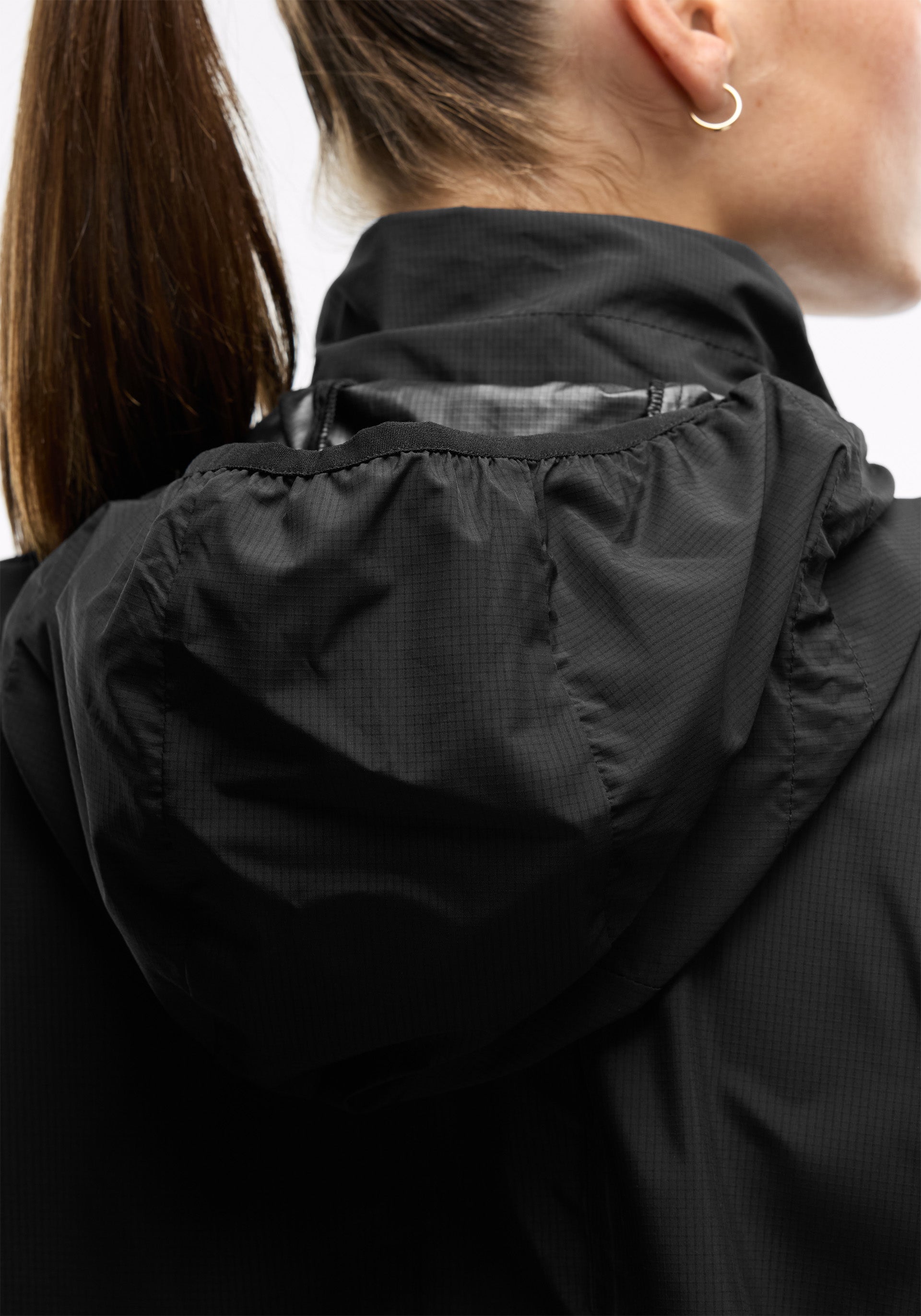 Full zip jacket with zipper garage, elastic at hem and cuffs, zippered hand pockets, and packable hood