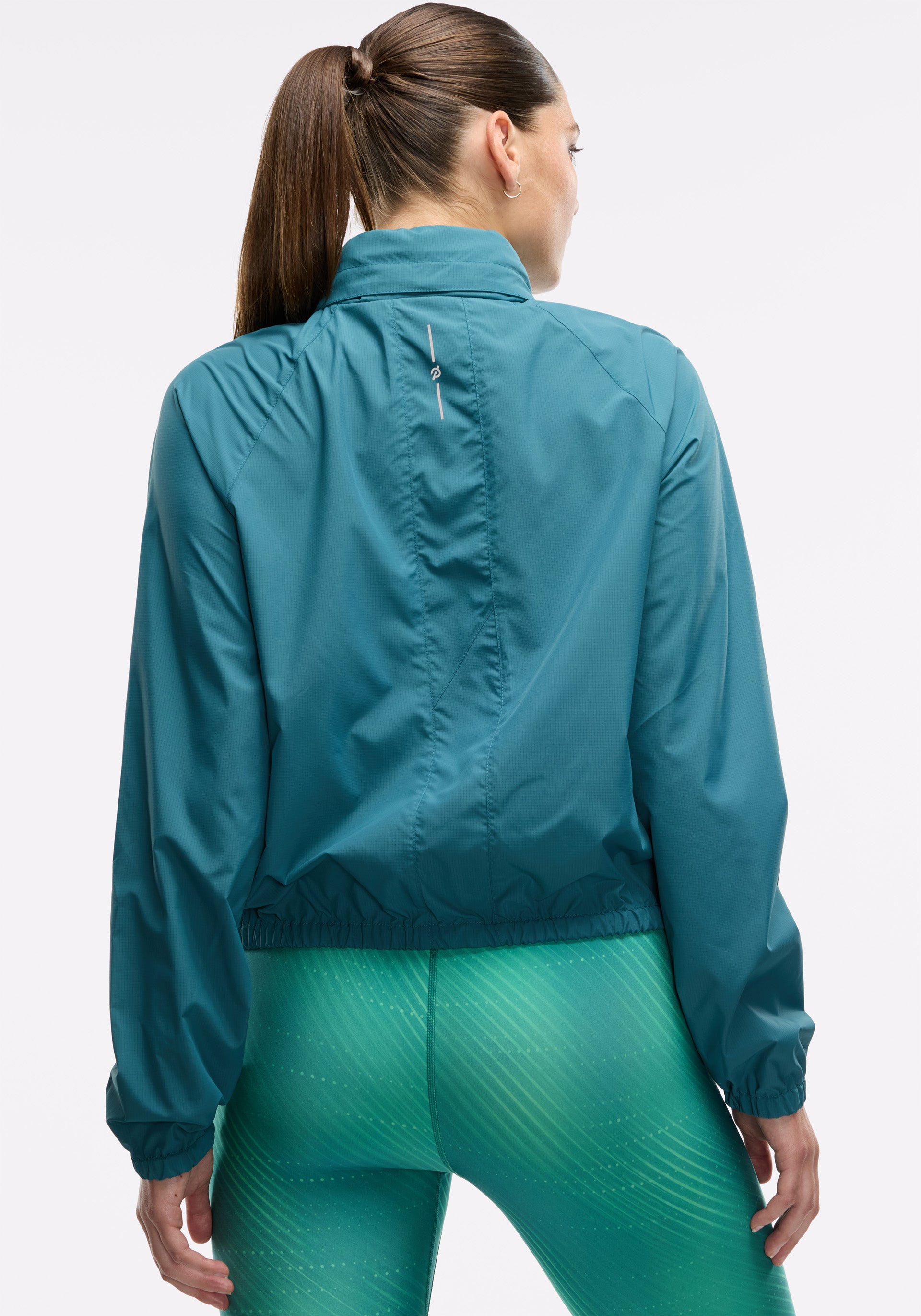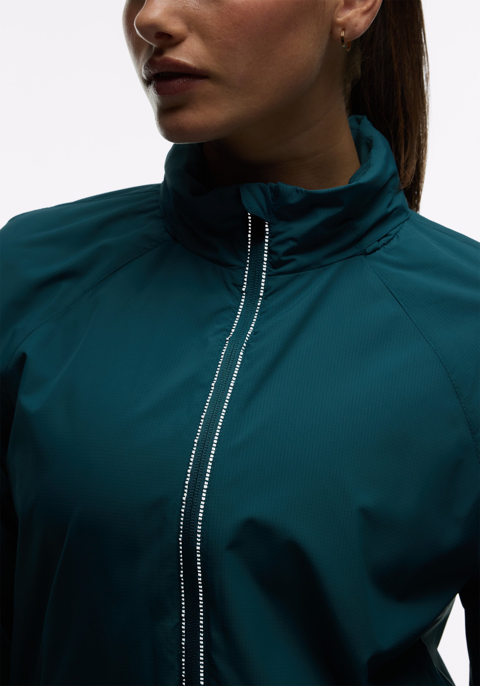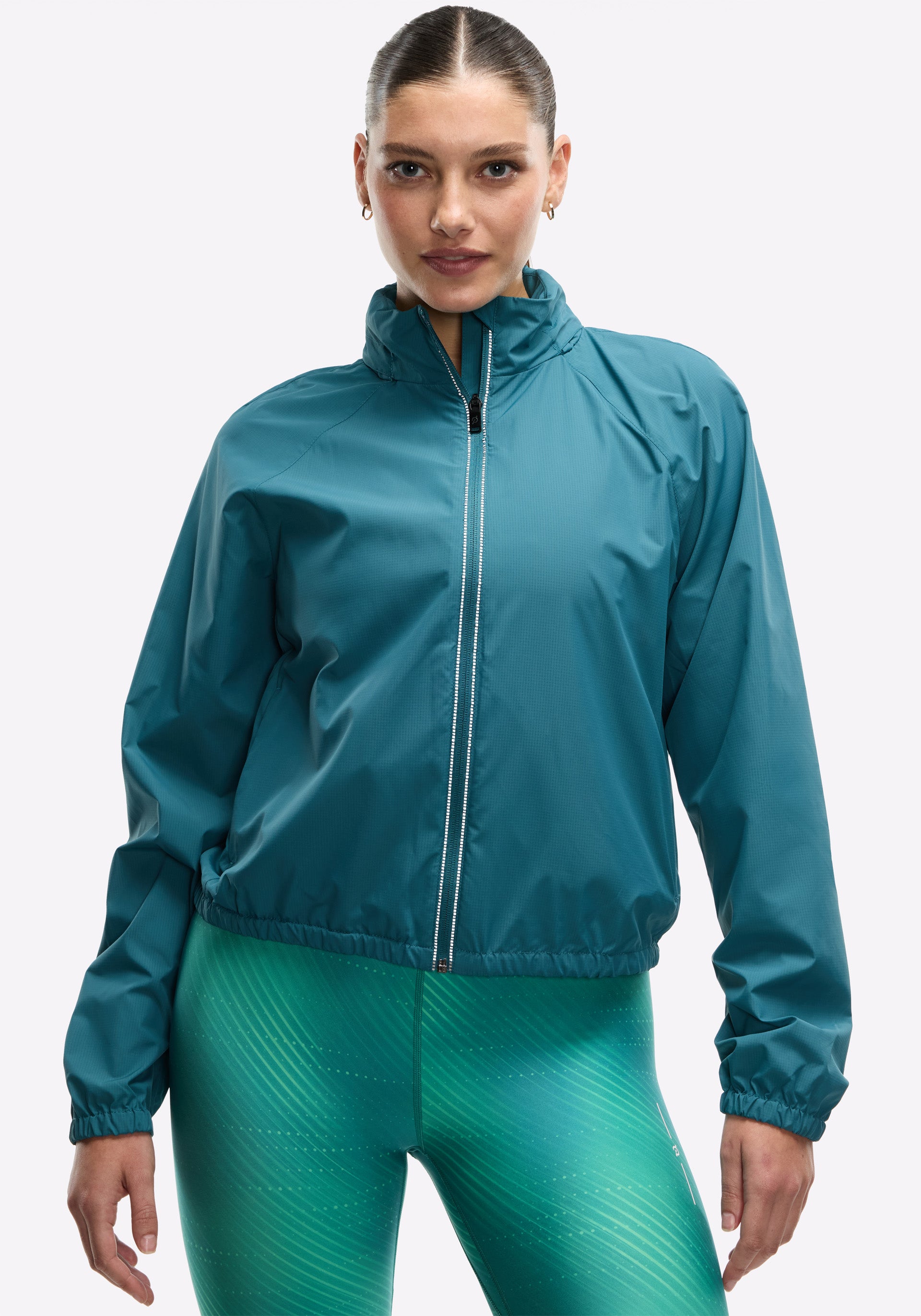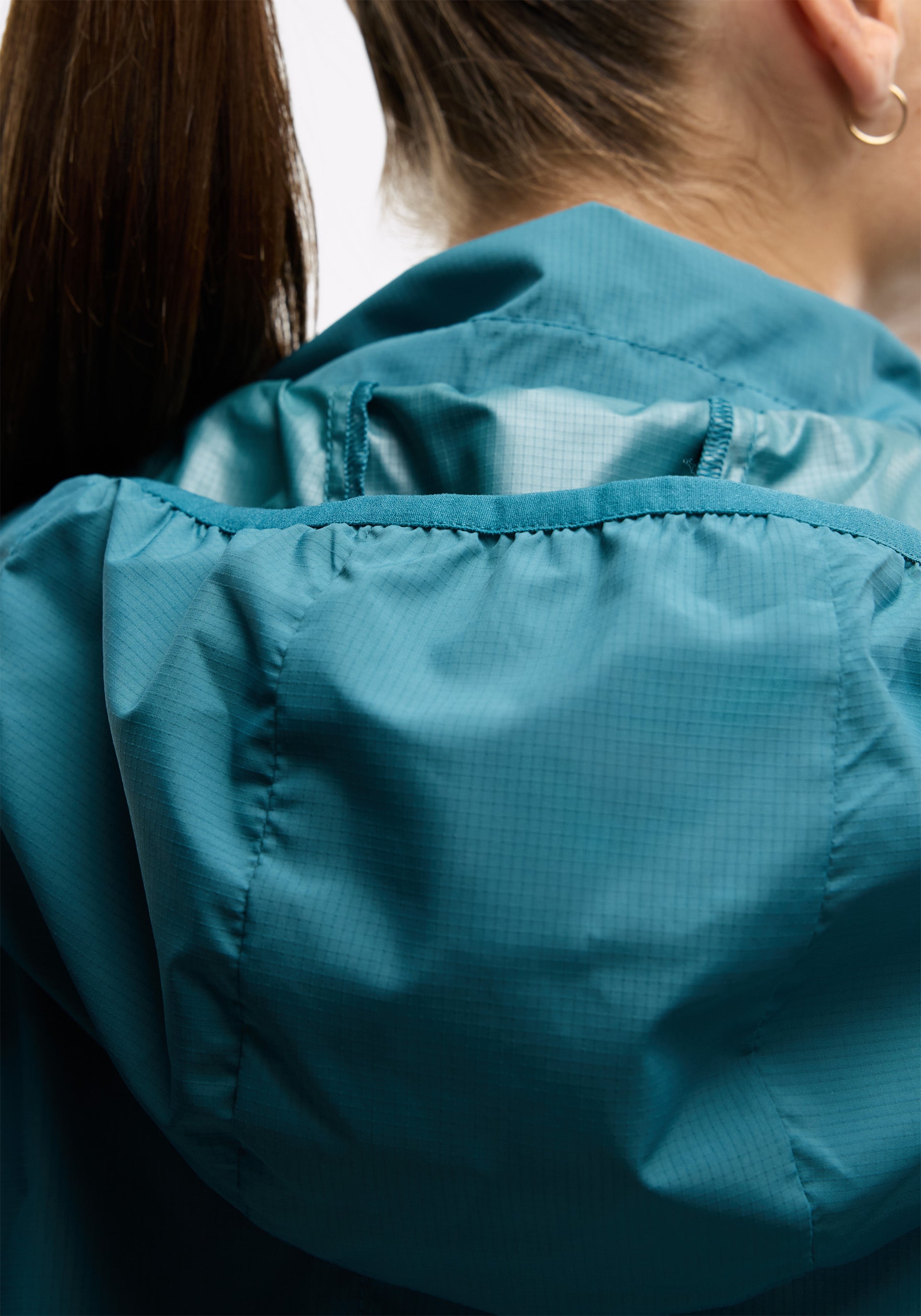 Full zip jacket with zipper garage, elastic at hem and cuffs, zippered hand pockets, and packable hood
